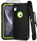 PQC iPhone XR Case with Belt Clip and 2 Pack Screen Protector - Military Grade Rugged Full Body Phone Case for Men and Women (Black+Green)
