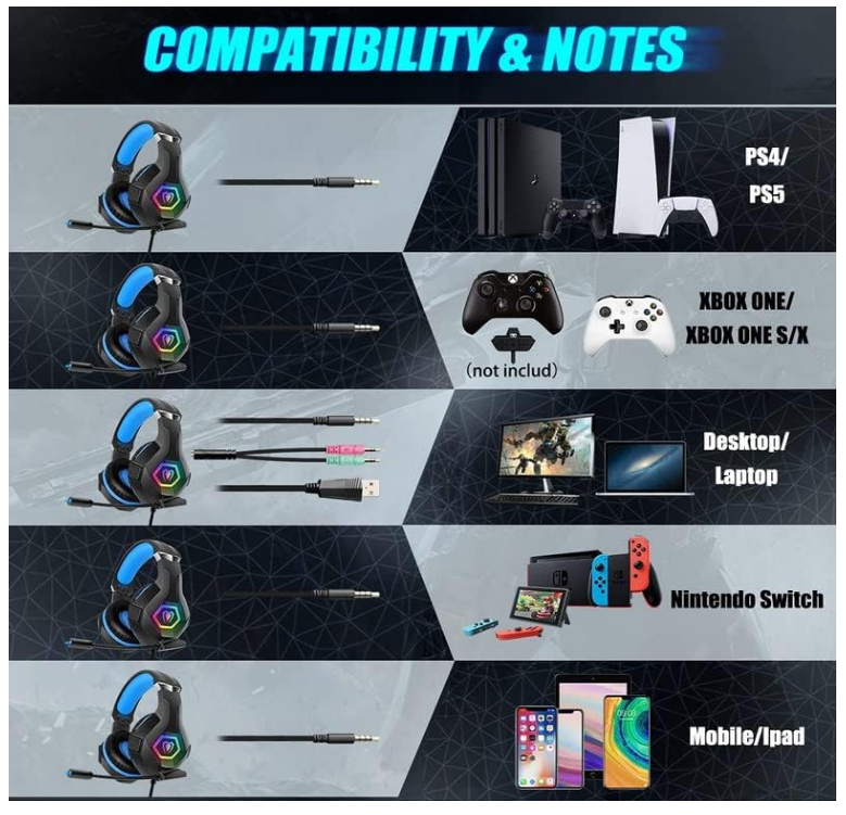 Gaming Headset for PS4 Xbox One PC, Over Ear Gaming Headphones with Noise Cancelling Microphone Volume Control RGB LED Light, for PC Laptop Mac Tablet Smart Phone BRAND NEW 【Immersive Gaming Audio】If you want to hear your enemies motion in games, wearing a professional gaming headset does matters. Our gaming headset offers up to a 360-degree surround soundscape, adds a sense of realism to your gaming session. 【Noise-cancelling Mic】The omnidirectional microphone captures the your voice yet eliminates unwanted background noise. If you wanna enjoy your valuable me-time without communicating with other players, you could turn off the mic by flipping the switch. 【Built for comfort】Soft leatherette ear cups and ergonomically padded headband allow for long gaming sessions without fatigue. 【Upgraded Breathing RGB Lights】7 colors automatically converted LED Lights design on the earcups, custom-built for gamers, highlight game atmosphere. USB only supplies power to the RGB lights. 【Versatile Compatibility】3.5mm interface Gaming headset support PS4, PS5, Xbox One, MAC, PC, Laptop, Tablet, Smart Phone. Notes: Need an extra Microsoft Adapter(Not Included) when connect with an old version Xbox One controller. DUE TO STORAGE THE BOX MAY HAS SLIGHTLY BENT! The real color of the item may be slightly different from the pictures shown on website caused by many factors such as brightness of your monitor. Listing and template services provided by inkFrog