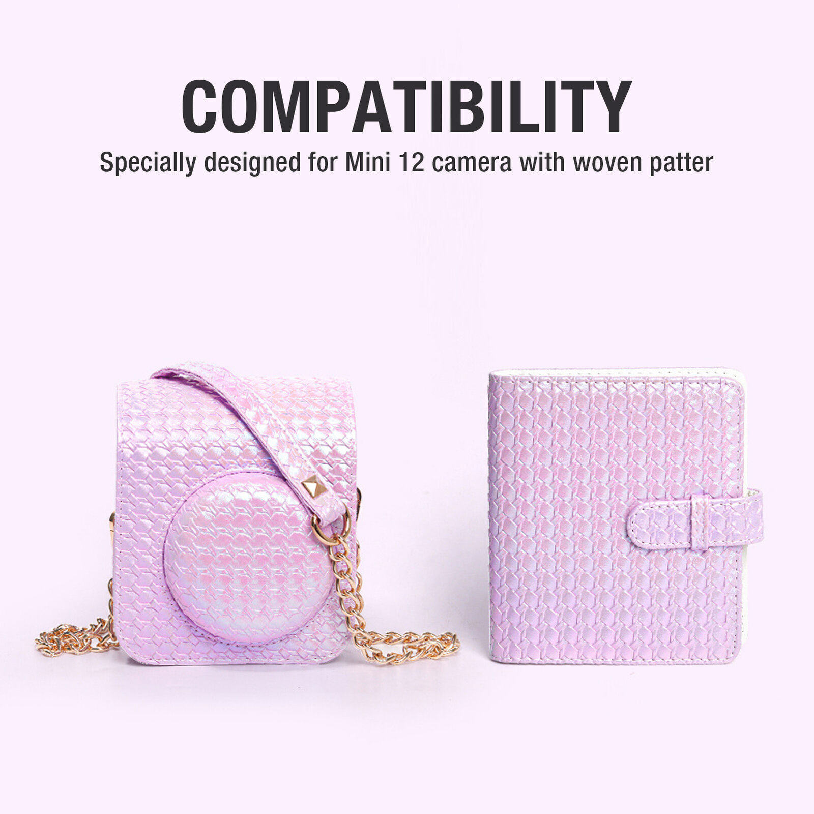 Feature: 1. COMPATIBILITY: Specially designed for Mini 12 camera with woven pattern, which protects your camera and enhances the beauty of your camera at the same time. 2. REMOVABLE TOP COVER: Comes with a removable top cover that allows you to take photos without removing the camera and shoot without obscuring the camera lens for convenience. 3. SHOULDER STRAP: Equipped with an adjustable and detachable shoulder strap, which is convenient for you to use according to your needs. It can also be detached and used with other camera bags, and can effectively avoid hands fatigue. 4. LARGE CAPACITY MINI ALBUMS: Each mini album has 64 transparent pockets, which can be used to store photos for various occasions, such as weddings, graduations, parties, traveling, birthdays, anniversaries, Christmas and so on. 5. ALBUM DESIGN: The album cover has a unique lattice texture and is made of premium PU leather, which is comfortable to touch and colorful, showing individuality and charm. Specification: Item Type: Instant Camera Protective Case Material: PU Leather Applicable Model: For Mini 12 Camera Package List: 1 x Instant Camera Protective Case 1 x Shoulder Strap 1 x Album On 07-Feb-2025 at 19:00:35 GMT, seller added the following information:
