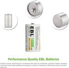 EBL add mix-protection additive to the negative pole of batteries, protect the material from degradation in the progress of charge and discharge, extend lifespan EBL add mix-protection additive to the negative pole of batteries, protect the material from degradation in the progress of charge and discharge, extend lifespan up, 1200 Tech. Low self-discharge batteries will remain 85% juice when you leaving it for no use 1 year Ni-MH high quality cell, no memory effect, can be charged and used at anytime. Embedded seal structure, ultra slim and make more inner space, using DBCK steel shell which can protect the battery against explosion due to overpressure. Product Description EBL D Size Rechargeable Batteries with ProCyco Technology (Upgraded Cells) EBL, since 1998, professional on batteries and chargers more than 26 years. EBL D Cell Rechargeable Batteries 10,000mAh, 8 Counts EBL - Professional Care and Low Self Discharge Professional and reliable on AA/AAA/C/D/9V/Cordless Phone Rechargeable Batteries and Battery Chargers. EBL always persistently providing high quality and services for everyone. Storage Case Included - D Size Batteries Package Contents: 8 X EBL D Size 1.2V Rechargeable Batteries ; 4 X Battery Case Easy to storage for D size batteries. Each 2 pcs D size batteries share one battery storage case. Features of D Batteries Quantity: Pack of 8 D Size 10000mAh Ni-MH rechargeable batteries. Excellent charge/discharge performance, the batteries will keep a high quality after 3-5 times charge & discharge when used in the first time or long time no used. Voltage: 1.2V Doesn't contain Hg/Cd/Pb, no pollution to the environment. Precharged 15%~20% of capacity by solar energy. Could be used when you get it. Longer life in the high drain devices than normal Alkaline batteries.