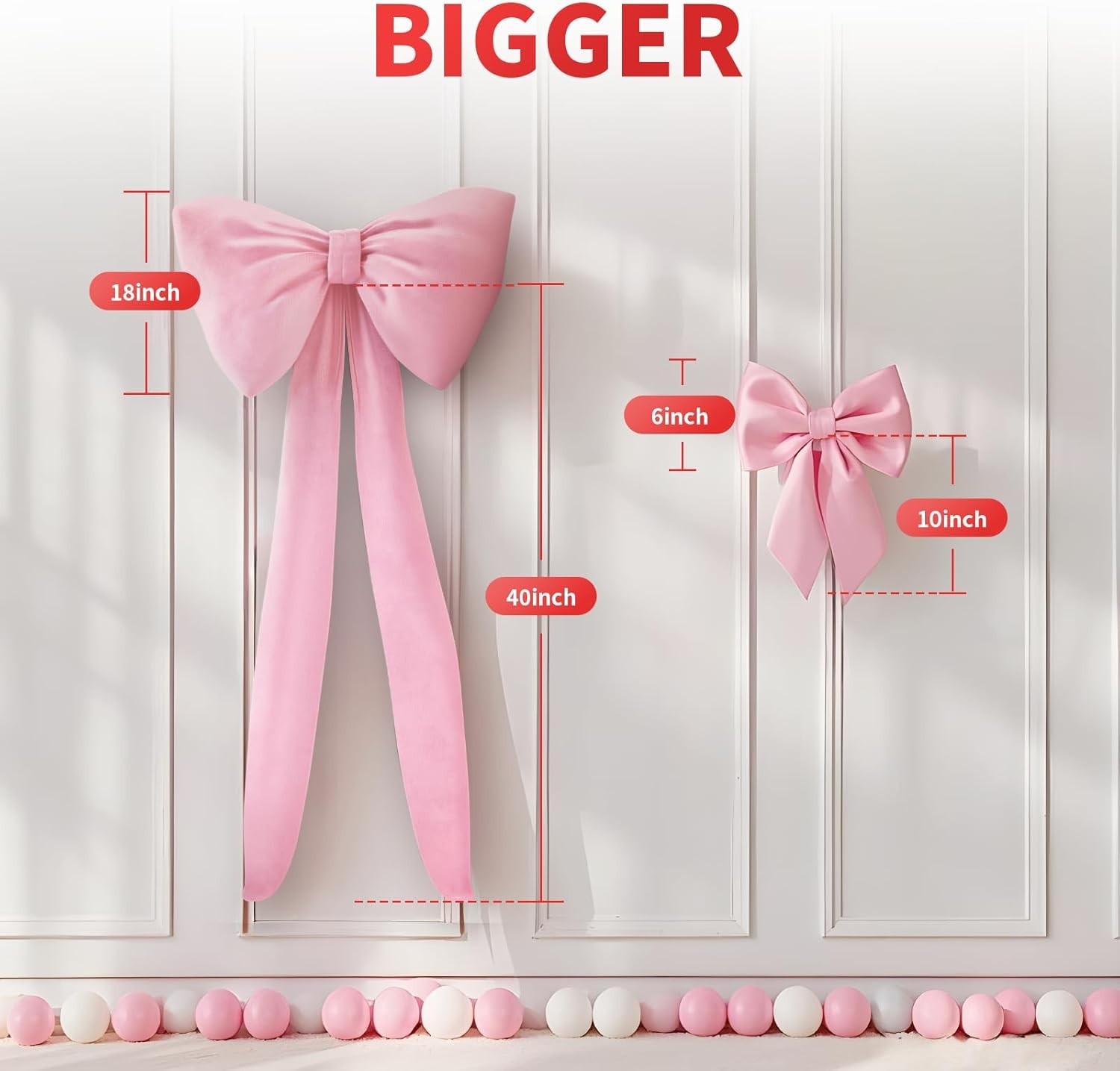 The product is a set of large 30''×18'' pink bows made of fabric, perfect for decorating birthdays, baby showers, or weddings. These bows add a touch of elegance and charm to any party or event, creating a festive and whimsical atmosphere. The vibrant pink color and beautiful bow design make them a popular choice for adding a personalized and stylish touch to special occasions.