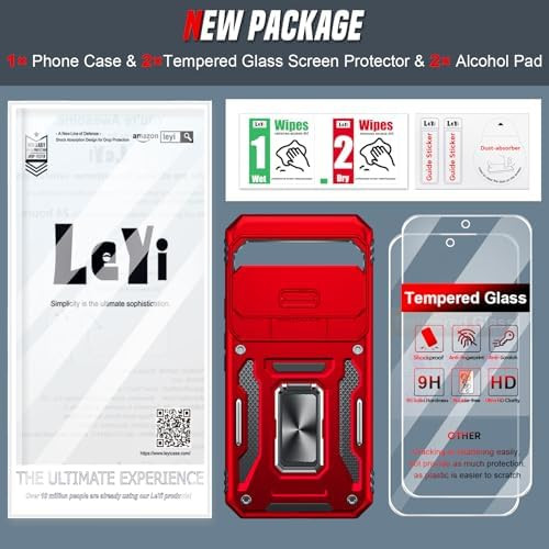 for Pixel 9 Case, Google Pixel 9 Pro Case 6.3Inch with Slide Camera Cover + 2 PCS Tempered Glass Screen Protector, Heavy Duty Full Body Military-Grade with Kickstand Funda para Pixel 9, Brand LeYi Compatible Phone Models Pixel 9 Color Red Compatible Devices Google Pixel 9, Google Pixel 9 Pro Material Tempered Glass Customer Reviews 4.8 4.8 out of 5 stars (16) 4.8 out of 5 stars See all product information About this item Compatible Model:Not Fit Pixel 9 Pro XL 6.8 inch!!! Fits perfectly for Pixel 9/ Pixel 9 Pro 6.3inch with 2 packs tempered glass screen protectors and precisely calculated cuts sensitive buttons allow easy access to all ports, and other functions. Not fot for any other smart phone models 360°Rotating Ring Kickstand: Metal kickstand 360°rotation ring can provide multiple adjustable angles to watch videos and release your fingers. With one hand occupied, hold your phone with a single finger greatly reduce the risk of accidentally dropping down Magnetic Function: The magnetic sheet can be directly stably attached to the magnetic car phone mount convenient during driving time for navigation. In any occasions your phone won't drop easily, and it can never have to answer the phone with both hands Unique Sliding Camera Cover: The sliding lens cover can slide smoothly from one side to the other, and lock on both sides which won't slide randomly. It can protect the camera from scratches, collision, bumps, scrapes and impacts when placed face down and great drop Military-Grade Protection: The heavy duty and durable Google Pixel 9 /9 Pro case with shockproof supported by soft premium TPU frame and hard PC shell which can provides comprehensive 360° full body rugged protection from drops, shock, impacts, and scratches After Sales Service: Our products come with 180 days after sales service. If you have any questions or anything you feel unsatisfied with, please contact us. LeYi will happy to solve this for you within 24 hours