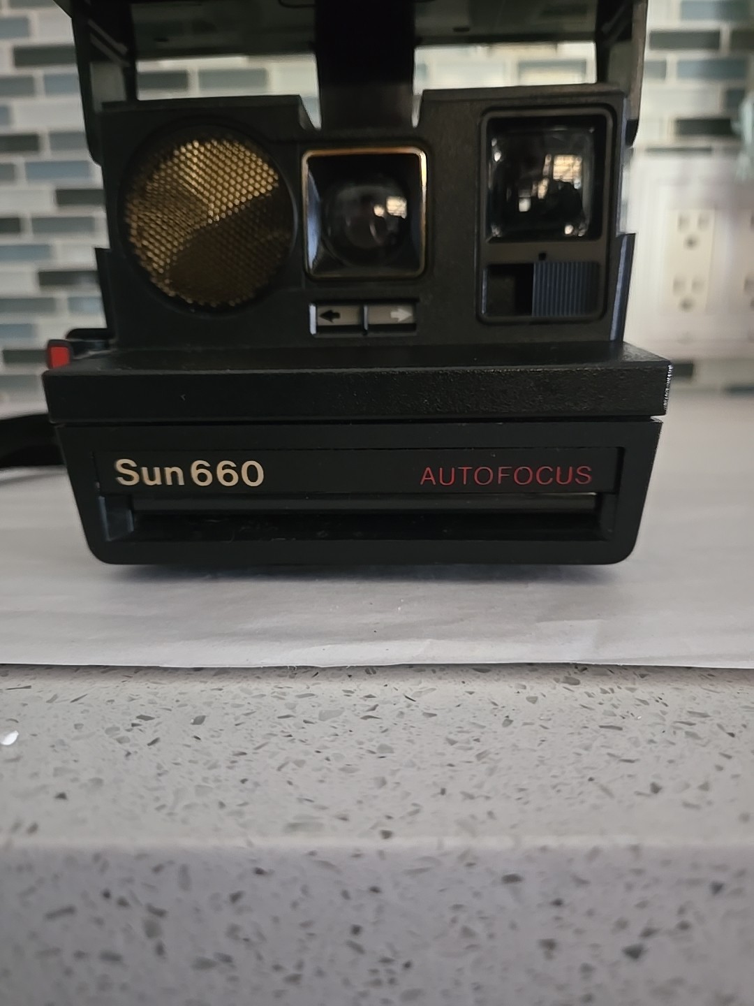 The Polaroid Camera Sun 660 Autofocus Instant Camera is a vintage photography device known for its iconic black color and sleek design. Made by Polaroid, this model is a classic piece in the world of instant cameras. With its autofocus feature, capturing the perfect shot is made easy and convenient. The camera is equipped with a strap for added portability and versatility in capturing moments on the go. Whether you are a photography enthusiast or a collector of vintage cameras, the Polaroid Sun 660 is sure to add a touch of nostalgia and charm to your collection.