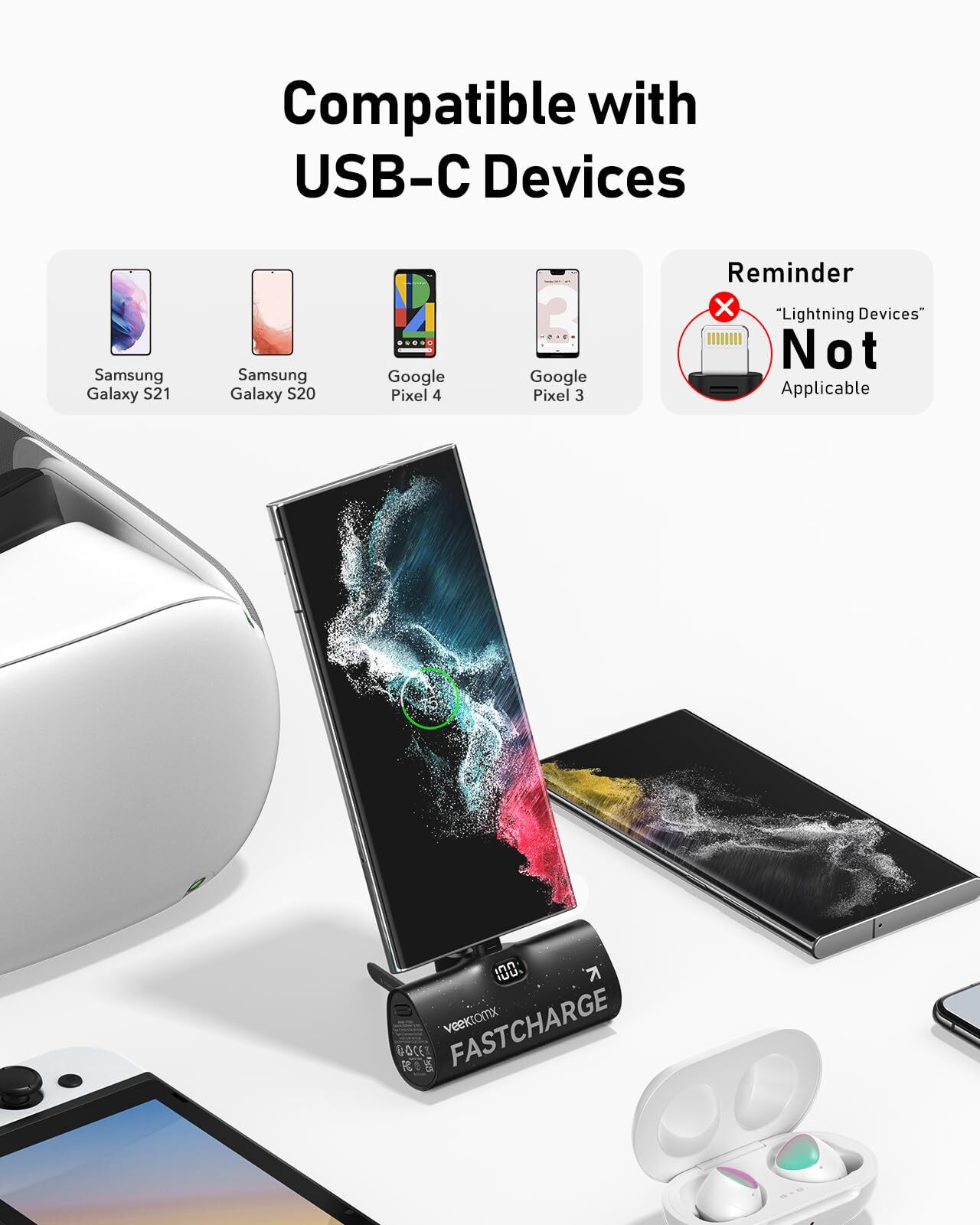 Faster Charging — Get ready for super-fast charging with mini portable charger! Featuring 20W PD fast charging capabilities, 400% faster than regular power banks, juice up your iPhone from 0% to 60% in just 30 minutes, outpacing old-school power banks by miles and staying powered up all the time! Portable Charger for Your iPhone 15 — iPhone 15 portable chargers are designed for the USB C Phones, including iPhone 15/15 Pro/15 Pro Max, Samsung Galaxy S23/S22/S21/S20/S10/S9, Note 20/10/9, Google, Huawei, and Android Phones, etc. Note: If you need an iPhone 14/13/12/11/X/8/7 portable charger, you can pick another charger which comes with a lightning charging plug. Ultimate Travel Essential — This mini portable charger is a must-have for travelers. With a compact design, similar in size to lipstick, it can easily slip into your pocket, purse, or bag. Whether you're on a long journey or a day trip, never worry about running out of energy by adding our 5000mAh portable charger to your pocket! Anytime, Anywhere Convenience — Comes with a built-in phone stand that easily holds your iPhone 15 horizontally or vertically. Supports pass-through charging technology, convenient for catching up on your favorite show, listening to music, or conducting video calls with your loved ones. Case & LCD Friendly — Supports cases that are less than 4mm thick. Equipped with an LCD display on the charger bank, you easily monitor remaining power and optimize your charging routine for maximum efficiency. Enhanced Protection Design — Say goodbye to vulnerable plugs! Implemented a stunning cosmic casing, along with a durable silicone dust cover, provides ultimate protection against damage in any environment.
