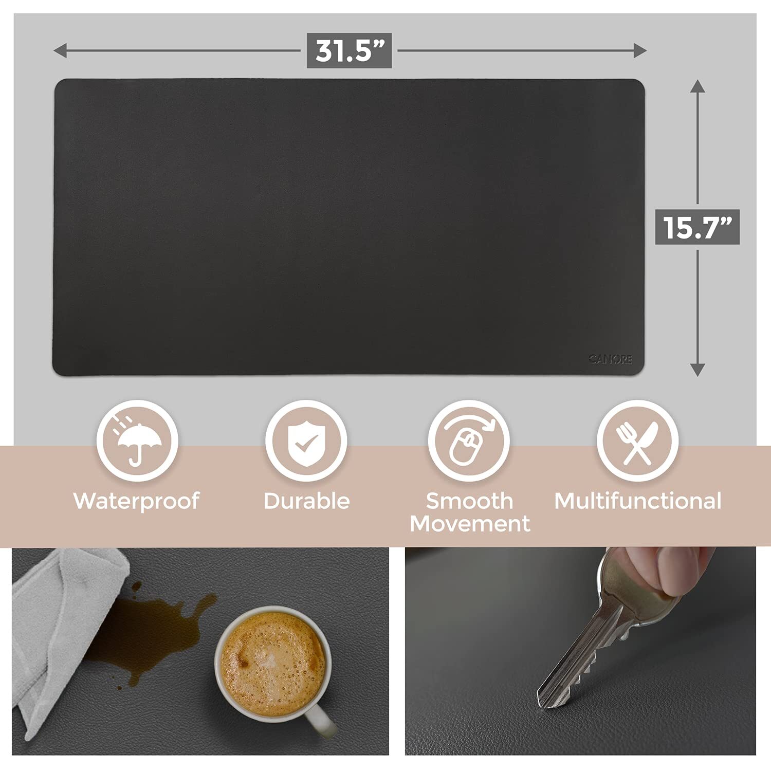 Extra large. Better than a pad. With a size of 31.5 x 15.7 inches, it’s large enough for all your devices.The Premium Vegan leather is designed to let you work, play, and write in ways you’ve never imagined. Desk Protection. Made to last: An edge-to-edge leather surface made to protect your desk from scratches, stains, and spills. ’s desk mat is exceptionally durable, easy to clean due to its premium quality vegan leather with anti-slip suede back. Waterproof. Easy to Clean. Life-changing: The love for your coffee, tea, or just a glass of water is real but it shouldn’t ruin your desk. Avoid staining your desk or table with spilled beverages by using this waterproof desk mat. Oops, you spilled something? Don't worry! Just use a wet wipe or some paper to wipe the surface - easy as that! Special Non-slip Technology. Isn’t it annoying when the desk mat moves every time YOU move? This desk mat is designed to stay in place with its Suede Felt Bottom which increases friction resistance to avoid moving around. Portable Laptop Stand Included: BONUS! We’ve included a laptop stand to raise your screen to eye level, so that at the end of the work day you don’t feel any pain or strain in your neck and back. The laptop stand is lightweight and portable, so you can easily carry it with you anywhere you go - changing up your workspace gets the creative juices flowing!