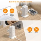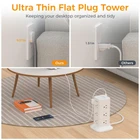 Flat Extension Cord 6FT: With only 0.31 in ultra thin flat head design, flat plug power strip can easily fit in tight spots and hide behind sofa, bed, nightstand or other furniture, sitting flush against the wall; 45° right angle design create an extra space for other plug below without blocking Power Strips with Surge Protection: Equipped with overload protection, short-circuit protection, over-current protection, and etc; Reliable on/ off switch can automatically shut off and protect your expensive electronics, providing you with a safe and reliable charging environment 15 in 1 Power Strip Tower: This flat outlet extension cord could turn 1 socket into 12 AC outlets and 3 USB ports, can charge 15 devices simultaneously without blocking, keep your desktop organized; You can use it in any indoor place such as home, office and dorm room Power Strip with USB C: Dual USB A ports features 2.4A, the USB C port features 3A; 2 types of USB ports can detect charged devices and deliver optimal charging speed, giving you more charging options; idea for USB devices like cell phone, tablet, earphone, etc Space Saving Design: 4-side compact design tower power strip takes up little space on your desk, cleans various cords and creates a neat and tidy space; Stable base with 4 rubber feet at the bottom, efficiently keeps this 6 ft extension cord from slipping and sliding