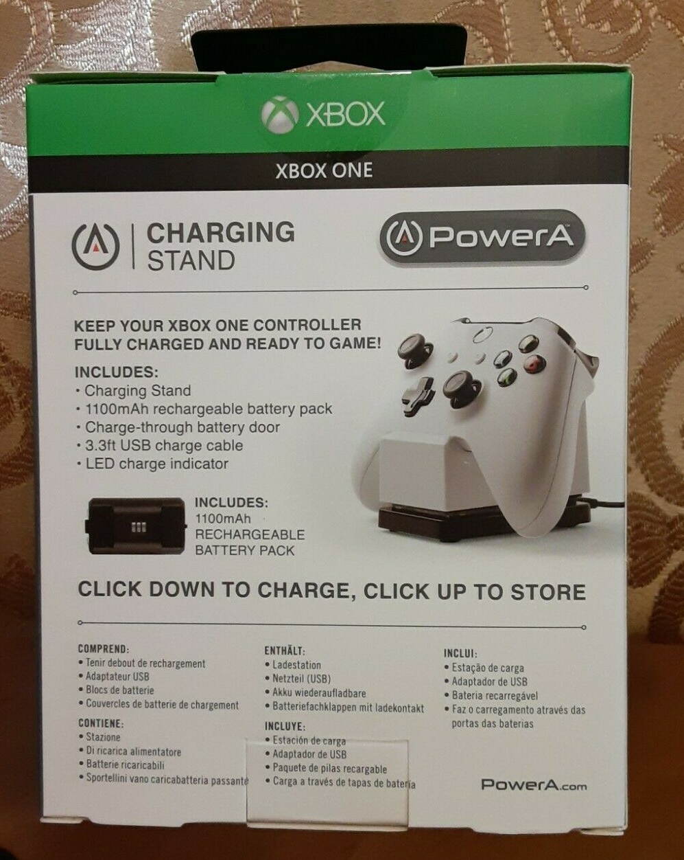 **NEW**PowerA CHARGING STATION FOR XBOX ONE, SEALED 1--PowerA CHARGING STATION FOR XBOX ONE & XBOX ELITE WIRELESS CONTROLLERS INCLUDES: ..CHARGING STATION ..1100mAh RECHARGEABLE BATTERY PACK ..CHARGE-THROUGH BATTERY DOOR ..3.3 FT. USB CHARGE CABLE ..LED CHARGE INDICATOR ( XBOX CONTROLLERS SOLD SEPERATELY ) CLICK DOWN TO CHARGE, CLICK UP TO STORE GREAT GIFT IDEA ITEM AS PICTURED NEW IN UNOPENED ORIGINAL PowerA SEALED BOX FREE SHIPPING WITHIN THE LOWER 48 STATES US APPRECIATE YOUR BUSINESS