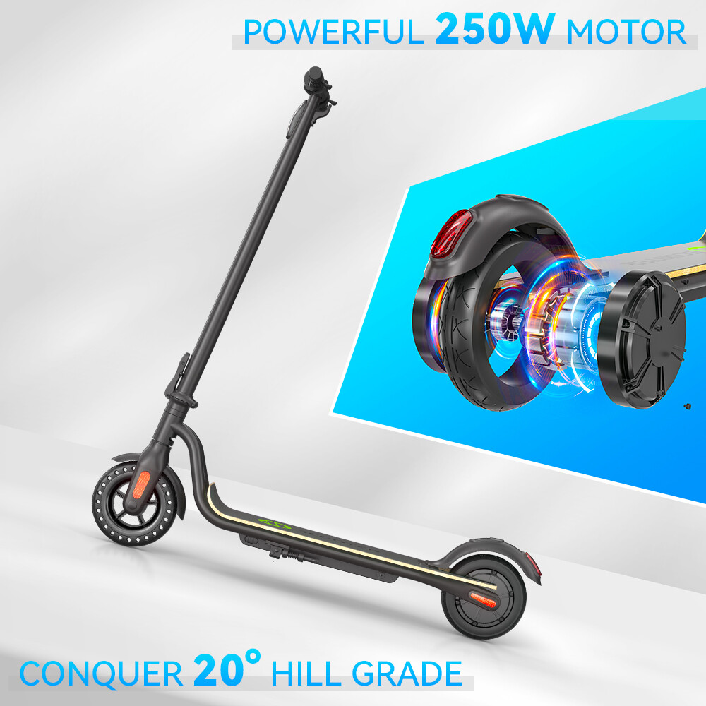 Main features: LONG RANGE BATTERY LIFE - Powerful 250W motor and 5.2 Ah/36V lithium battery pack that supports a speed of up to 15.5 Mph with a range up to 7 Miles. Updated large-capacity battery life, designed for commuters and longer distances. 8.0" HONEYCOMB & SOLID TIRES - Shock-absorbing rubber tires offer a smooth ride even over bumpy surfaces. PORTABLE FOLDING DESIGN - Electric scooter can be folded easily in 3 seconds with quick folding latch for easy carrying and storage. BATTERY INDICATOR AND LIGHTS - Battery indicator keeps to track battery life. Ultra bright LED headlight and taillight. Fast recharging about 5 hours. GEAR SHIFT SETTING - 1st gear for a 7.5 Mph comfortable ride or 3rd gear to get the 15.5 Mph fast experience. Extremely fun to ride and end boring commutes. Specification: Brand: Megawheels Model: S10 Dimension: Unfolding 105 x 43 x 118 cm; Folding: 105 x 43 x 48 cm Net Weight: 11.9kg Color: Black Frame Material: Aluminium Tires: 8.0" Honeycomb Front Tire & Solid Rear Tire Max Load: 100kg Max speed: 25KM/h Speed level: Gear 1--Max 10km/h ; Gear 2--Max 20km/h; Gear 3--Max 25km/h Mileage: 8-12km Grade Ability: 20 degree slope Working Temperature: -15°C-50°C Storage Temperature: -20°C-25°C Mode Type of Motor: Brushless hub motor Battery Type: High quality lithium battery Battery Capacitiy: 5.2 Ah Battery Voltage: 36V Charger Input Voltage: 100V-240V Charger Frequent: 50Hz/60Hz Charging time: 4 hours Package Contents: 1 * Folding Electric Scooter 1 * Battery Charger 1 * User's Manual Riding Skills: -Put your foot in the front of the scooter and the other foot on the floor before riding. -Make sure that the riding route is smooth. -Slide forward with the food standing on the floor before starting (like riding the scooter without power). -Immediately press the acceleration button and lean forward to avoid falling over backward due to inertia, so that the electric scooter will enter the working status. -Avoid pressing the handle with your body in the acceleration and deceleration process. Put one foot ahead and the other behind (like on the sliding plate/surfboard, put one foot ahead and the other behind by 70-90 for better comfort). -Turning – The turning principle of the electric scooter is the same with that of surfboard/sliding plate/skis. The handle shall be balanced with the body. Observe and make sure that turning is safe before turning. Tips: Before riding the scooter, please put one foot on the scooter deck and the other foot on floor and push the scooter forward by kicking the floor for some distance, in this way, the scooter will get some impulse to run forward. Note: This products have been certified under UL2272 safety standards.