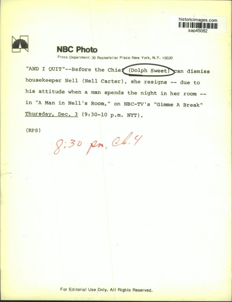 ebay template Note: Please study the images carefully to determine the condition of this vintage photograph, as it may not be in perfect condition. It may contain wrinkles, cracks, and possibly even tears due to its age and how it was handled before it got to us. A scanner may interpret colors and contrast differently than human eyes will, so it is possible that the actual photograph may be slightly darker or lighter in person. This vintage photograph is offered for sale as a collectible item and conveys no transfer of copyright. Press Photo Nell Carter and Dolph Sweet star on Gimme A Break, on NBC. This is an original press photo. Before the Chief (Dolph Sweet) can dismiss housekeeper Nell (Nell Carter), she resigns - due to his attitude when a man spends the night in her room - in "A Man in Nell's Room," on NBC's "Gimme A Break." Photo measures 7 x 9 inches. Photo is dated --none. PHOTO FRONT PHOTO BACK Historic Images Part Number: sap45082 Sell Smarter with Kyozou. Inventory and Ecommerce Management