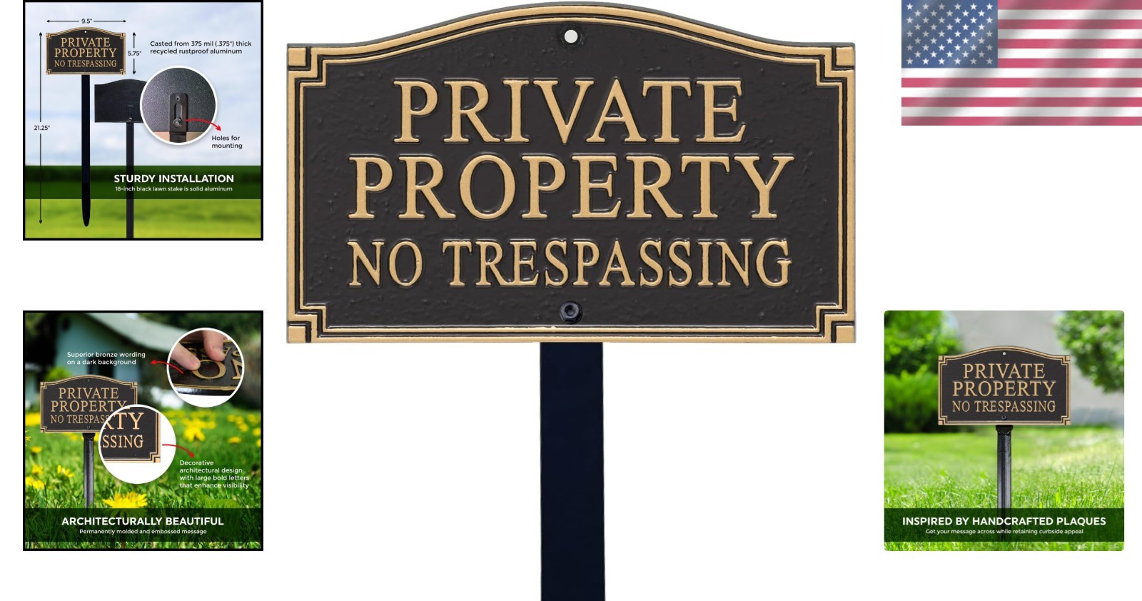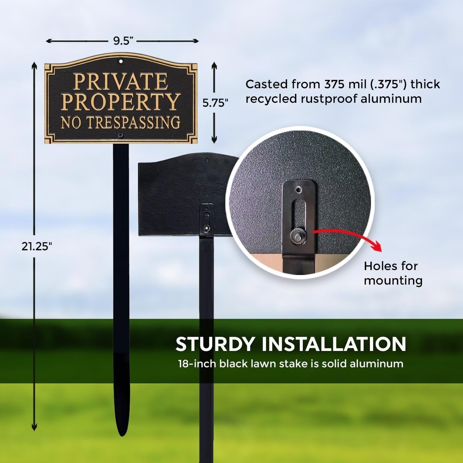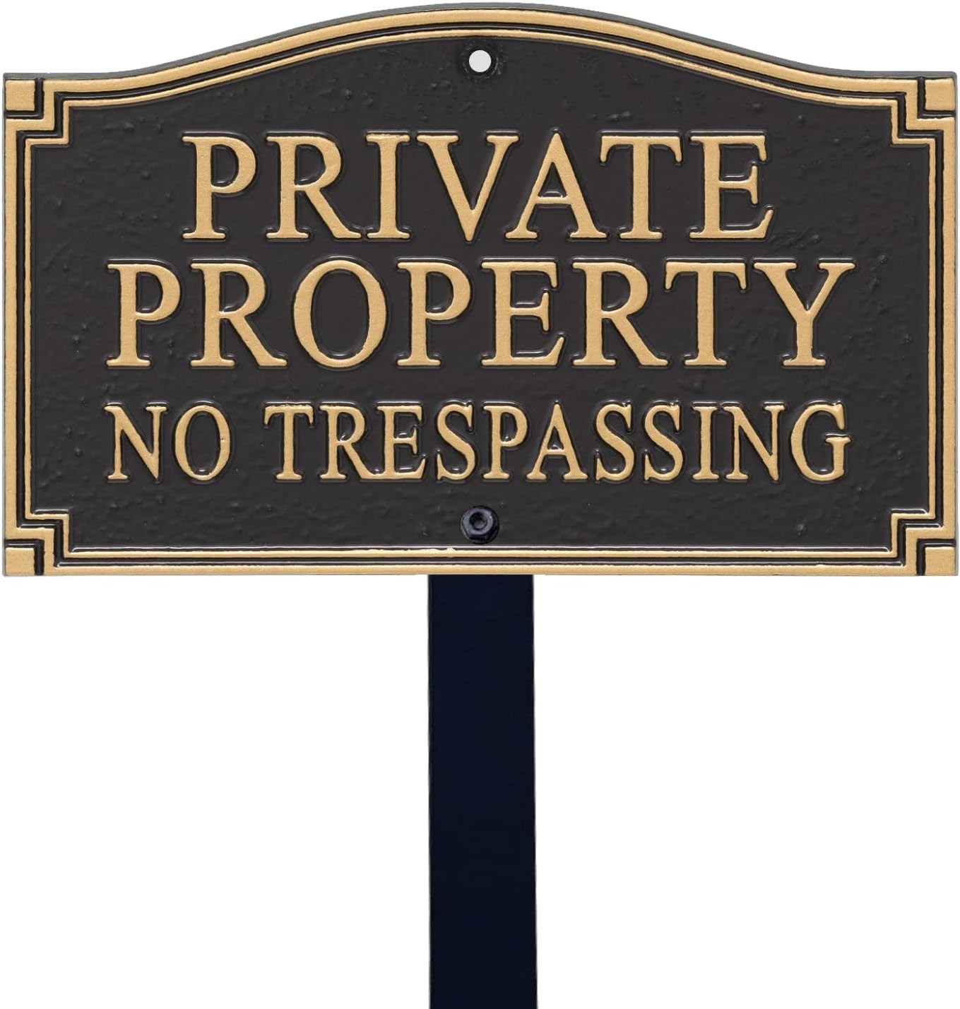 Private Property Metal Plaque with Lawn Stake ‹ › ‹ › ‹ › ‹ › ‹ › ‹ › ‹ › ‹ › ‹ › ‹ › Private Property Metal Plaque with Lawn Stake Elevate the elegance of your property with our exquisite Private Property Metal Plaque, thoughtfully designed to combine durability with aesthetic appeal. Features: DURABLE : Crafted from 375 mil (.375") thick recycled aluminum, this plaque is rustproof and built to stand the of time. ALUMI-SHIELD COATING : Our exclusive Alumi-Shield coating is engineered to endure harsh weather conditions, repel UV rays, and preserve the plaque's stunning finish. ARCHITECTURAL DESIGN : Featuring a decorative architectural design, the plaque presents large, bold letters for enhanced visibility, making it both functional and stylish. INSTALLATION : The classy golden black plaque includes an 18" aluminum lawn stake and all necessary hardware, ensuring effortless installation in your yard or garden. PACK CONTENTS : You will receive one plaque, one stake, and the required hardware for easy setup. Benefits: Durability that withstands the of time and the elements. Elegant design that enhances the curb appeal of any property. Effortless installation process with included stake and hardware. Increased visibility with bold lettering, ensuring clear communication of property boundaries. Why choose our Private Property Metal Plaque? Your property deserves a touch of elegance and security, and our Private Property Metal Plaque serves both purposes magnificently. Made of robust materials and designed to be visually striking, this metal plaque not only marks your private space but also contributes to the overall beauty of your outdoor environment. Ensure that your property is well-defined and beautifully showcased with this durable and stylish sign. Don’t wait to add a statement piece to your property—order your Private Property Metal Plaque today and enhance your outdoor space. Shipping Free & Fast Shipping - We offer free shipping to most of the USA with a normal delivery time of 3-10 business days. However, due to various situations, additional delivery time (up to 3 weeks) may be required for some items. Alternative Carriers - We may use alternative carriers (e.g. USPS, FedEx, UPS, etc.) to ensure your package arrives safely and on time. Due to the use of multiple carriers, we are unable to provide a tracking number automatically. Handling Time - Orders are processed and shipped within 1-5 business days of receiving cleared payment. Shipping Restrictions - Shipping to Alaska, Hawaii, Puerto Rico, Guam, and other US territories may incur shipping charges or delivery restrictions. Please contact us before ordering, or your order can be refunded/cancelled. State Restrictions - There may be restrictions based on your state of purchase. For example, certain items may not be shipped to California due to state regulations. Contact for Tracking Updates - If you require tracking updates or have any concerns about the delivery of your order, please feel free to contact us, and we will be happy to assist you. Return 30-Day Hassle-Free Returns - We want you to be completely satisfied with your purchase. If you are not, you can return the item within 30 days of receiving it for a full refund or exchange. Easy Return Process - To start a return, simply contact us and we will provide you with a prepaid return shipping label and detailed instructions. Restocking Fee - There are no restocking fees for returns. However, the buyer is responsible for return shipping costs if the return is not due to a seller's error. Refund Processing Time - Refunds will be processed within 5 business days of receiving the returned item in its condition. Payment We accept all major credit cards, PayPal, and Apple Pay for your convenience. Your payment information is secure and encrypted to ensure a safe and seamless transaction. Please complete your payment within 3 days of purchase to avoid any delays in shipping. Feedback Your feedback is extremely important to us. We strive to provide the best products and customer service possible. If you are satisfied with your purchase, please take a moment to leave us a positive review. If you have any concerns or issues with your order, please contact us before leaving negative feedback. We are committed to resolving any problems and ensuring your satisfaction. Contact Us If you have any questions or concerns, please feel free to out to our customer support team. You can contact us through the eBay messaging system. We are available Monday to Friday, 9:00 am to 5:00 pm EST, and we will do our best to respond to your inquiry within 24 hours. Buy it now and enjoy a pleasant shopping experience! Unit Quantity: 1.0 Material: Aluminum,Recycled Aluminum Room: Outdoor Features: Durable,Rustproof,UV Resistant,Alumi-Shield Coating,Architectural Design Mounting: Ground Mount Care Instructions: Easy Care Type: Plaque Style: Architectural Subject: Private Property Shape: Rectangular Finish: Brushed Color: Black Size: Medium Orientation: Portrait Item Weight: 2 lb