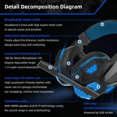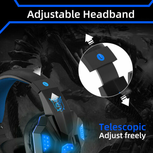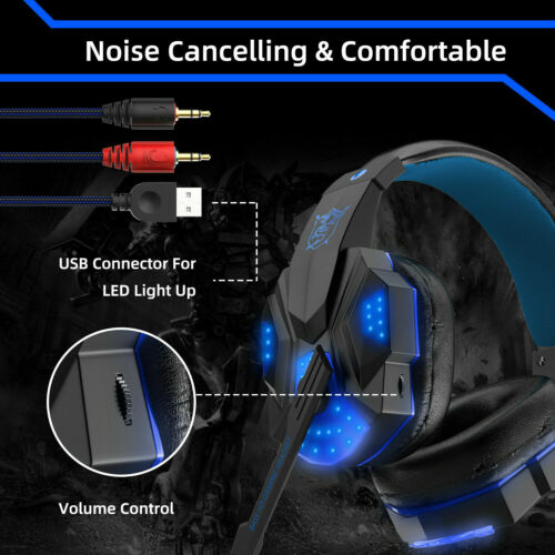 Wireless Gaming Headset for PS4 PS5 Xbox One LED Gaming Headphone Stereo Bass US Item Description Gaming Headset for PS5, PS4, PC, Xbox One, Surround Sound Over Ear Headphones with Mic, LED Light for Mac Laptop Switch PlayStation Xbox Series X/S Audifonos Gamer con Microfono Para PS4 Xbox PC Nintendo Switch Conector 3.5 mm Cascos Gaming PS4 Audifonos Auriculares Gamer PC Xbox One Gamer Con Microfono PS 【Superb Compatibility for Multi-Platform】 This gaming headset supports PS5, PS4, PS4 Pro/Slim, Xbox One, Xbox One S/X controller, PC, Nintendo Switch/3DS, PSP, Game boy advance, Sega dreamcast, Laptop, Computer, Tablet, iPad, Mobile Phone. NOTE: old version Xbox One need extra adapter to support. 【Adjustable Noise-cancellation Microphone】 The gaming headphones are omnidirectional adjustable and flexible to pick up voice in 360 degree. External Audio Control: Mute button and volume control housed on military grade durable braided wire are designed conveniently for quick and convenient adjustment. 【Immersive in Super Real Gaming Experience】 The PS5 headset with high-grade 50mm driver with neodymium magnets delivers clean clear bass and acoustic positioning precision, you can feel the full force of an explosion, a grenade blast, or a dubstep drop. Perfect for Various Games: Like Minecraft, Fortnite, Halo 5 Guardians, Metal Gear Solid, Call of Duty, Star Wars Battlefront, Overwatch, World of Warcraft Legion, etc. 【Humanized Design, Built to Stay Comfortable】 The softly padded retractable headband design allows you to find the perfect fit without constraint and provide excellent durability, suits all gamers at any age. The synthetic leather-wrapped ear-cushions is thicker and bigger which ensures play-all-night comfort! PLUG & PLAY: No setup or installation necessary. 【Uniquely Designed Gorgeous Led Lights】 The Xbox One Headset with big led lights designed on earcups is cool enough to maximize blast the atmosphere of the whole game. The USB interface is only used to supply power to the LED lights on the earcups. Detail Images Shipment All item will be carefully packaged very well with safe material and shipped to US States. Items will be sent in 2 working days,usually shipped by USPS Priority Mail. It will take about 3-5 days to US addresses. If you would like to ship by other shipment methods,please contact us.( shipping cost will be combined for multiple items you purchase at a time.) Payment Only PayPal is acceptable.It is a safe and easy payment method for buyers. Please pay in 48 hours after you win the item(s).If payment cannot be made in five days,your order(s) will be claimed as unpaid case and the item will be relisted. Return & Refund Customer satisfaction is our first priority. 30-days return is available after delivery. However, return shipping and insurance cost will be on buyers. Please email us before returning. Delivery date will be different according to UPS or USPS tracking system, so please inspect your item immediately upon arrival. Money will be return to you after the return item is sent back. We can not refund to you, if your return item is broken or damaged. Please ensure its safety. Feedback Your feedback is very important to us. If you can't leave us a "5-Star" rating and a positive feedback, please contact us without hesitation before leaving feedback. We are eager to work with our customers. We believe in communication. Give us a call or send us an email, we will make things right for our buyers. Positive feedback for our buyers will be left automatically by eBay Seller Manager Pro.