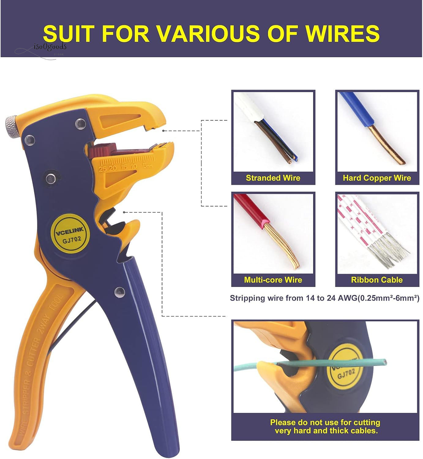 Multifunctional Design This 2-in-1 quick strip wire stripper tool ensures precise and clean stripping of 14-24AWG solid core or stranded wires, making it ideal for stripping speaker wires or flat ribbon cables. Easy to Use The handle is spring-equipped, allowing effortless wire stripping with a gentle press. The insulation automatically comes off, simplifying the process and saving time compared to traditional wire stripper pliers. The ergonomic, non-slip handle enhances comfort for frequent wire stripping tasks. Compact & Portable Crafted from lightweight yet durable materials, this auto wire stripper minimizes hand fatigue. Its compact size makes it easy to carry in a tool bag or drawer, ideal for DIY enthusiasts, electricians, or repair technicians. No Damage to Wire Core The pressure adjustment knob lets you fine-tune the stripping pressure based on wire thickness, ensuring perfect stripping without damaging the wire core. The eagle nose design allows for quick stripping even in narrow spaces. The length adjuster provides precise control over the stripping length. Customer First You will receive 1 Small Wire Stripper with your purchase. Our priority is customer satisfaction, and we offer an 18-month warranty for all products. If you have any issues or advice, please contact us, and we'll resolve your problem within 24 hours. Product Description Multi-Purpose Automatic Wire Stripper by VCELINK Features: Self-adjusting jaws firmly grab wire and cable from 14-24 AWG Precise blade design prevents damage to conductor cores Adjustable peeling tension for various insulation thicknesses without damaging the copper core Ergonomic handle saves time for multiple wire stripping tasks Longest stripped length up to 20mm (1/4-3/4 inch) Metric and inch sizes marked on pliers Eagle mouth design for tight spaces Built-in wire cutter with a range from 0.8 mm-8 mm Reset springs for easy and efficient wire peeling and cutting One-handed completion with high carbon alloy steel Note: Do not use to cut steel or iron wire. Suitable only for wire insulation stripping. Specifications: Wire stripping range: 12-24 AWG (0.2mm²-3.3mm²) Cutting range: 14-28 AWG (0.08mm²-2.0mm²) Twist Wire stripping range: 10-24 AWG (0.2mm²-5.5mm²) Cutting range: 12-28 AWG (0.09mm²-3.5mm²) Ribbon Cable stripping range: 20-24 AWG (0.2mm²-0.5mm²) Cutting range: 8mm (MAX)