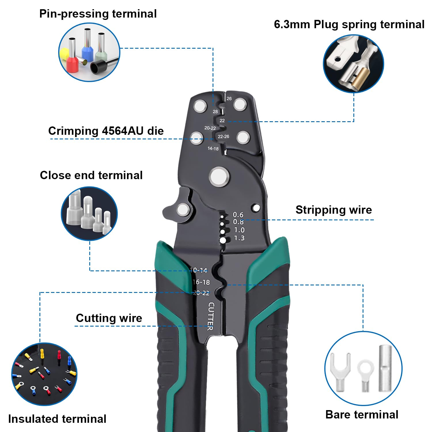 Say goodbye to the struggle of multiple tools - this multifunctional stripping crim does it all! Strip, crimp, and cut wires effortlessly with just one tool Versatile and efficient - handles wire crimping tasks with ease. Works with a range of wire gauges from 22 to 10AWG. Whether you're working with insulated or non-insulated connectors, this tool has got you covered Built to last - crafted from corrosion-resistant CRV steel, this tool is sturdy and enduring. The thick forging and precision polishing ensure a long lifespan. Plus, the non-slip handle and ergonomic design make it comfortable to use for extended periods From wire caps, butt/bullet/ring/fork/spade terminals, it can handle them all. Just remember to match the connector type with the corresponding crimping specifications Easy peasy wire stripping - the automatic opening blade makes wire stripping a breeze. No more struggling with manual adjustments. Simply grab this tool, and get your wire-stripping tasks done in a snap Product Description Used for insulated/Bare/Heat Shrink connectors Wire crimper,stripper and cutter Electrical crimping tool Wire crimping tool combines the functions of wire stripping, cutting, and crimping into one convenient tool, making your electrical projects a breeze Insulated terminals crimping(22-14AWG/0.25-2.5mm²) Bare terminal crimping(28-14AWG/0.25-2.5²) Stripping wires range is 0.6/0.8/1.0/1.3mm² Cutter wires range is 0.6-3.2mm² The video showcases the product in use. The video guides you through product setup. The video compares multiple products. The video shows the product being unpacked. Electrical wire connectors Add to Cart Add to Cart Add to Cart Customer Reviews 4.4 out of 5 stars 21 4.6 out of 5 stars 32 5.0 out of 5 stars 6 5.0 out of 5 stars 2 Price $9.88 $ 9 . 88 $5.99 $ 5 . 99 $17.99 $ 17 . 99 — Insulation Material PVC PVC PVC PVC Color Orange Multicolored Multicolored Multicolored Contact Material / Copper Copper Copper Package 1Pack 300pcs 201pcs 81pcs Connector Type / Spade Fork Spade Electrical wire connectors Add to Cart Add to Cart Add to Cart Add to Cart Customer Reviews 4.5 out of 5 stars 144 4.4 out of 5 stars 394 4.4 out of 5 stars 254 4.6 out of 5 stars 710 Price $15.99 $ 15 . 99 $9.99 $ 9 . 99 $8.99 $ 8 . 99 $8.99 $ 8 . 99 Insulation Material / PVC PVC Nylon Color / Multicolored Multicolored Multicolored Contact Material Copper Copper Copper Copper Package 80pcs 160pcs 200pcs 100pcs Connector Type Butt Bullet Ring Spade