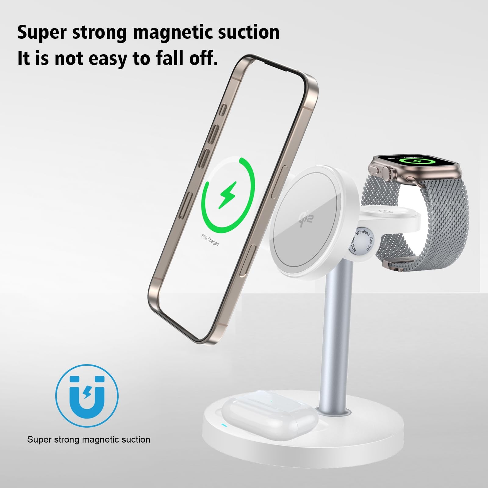 [Qi2 Certified ] iPhone 16 Magnetic Compatible Wireless Charger Stand, 18W Fast Magnetic Wireless Charging Station, Qi2 Certified 360° Charger, for iPhone 16/15/14/13/12 Series and AirPods 【Qi2 Certified Fast Charging】 Enjoy 18W ultra-fast wireless charging with Qi2-certified safety. Perfectly aligns with iPhone's magnetic charging for efficient power delivery every time. Combines speed, reliability, and convenience in one sleek package . 【magnetic charging solutions】 3-in-1 Wireless Charger with Magnetic Alignment - Simultaneously charges your smartphone (18W fast charging), wireless earbuds and smartwatch. Advanced magnetic charging technology ensures perfect positioning and optimal charging efficiency. 【Safe & Silent Charging 】 Equipped with intelligent temperature control and a whisper-quiet cooling system (<25dB). 3C/RoHS certified with multi-protection for safe overnight charging. 【Hands-Free Charging Stand】 – Enjoy convenient viewing while your device charges. The built-in stand allows for portrait or landscape use, perfect for watching videos, video calls, or working without holding your phone. Effortless charging in any position. 【Adjustable Charging Stand】 - This lightweight and portable charging station features a versatile adjustable stand, perfect for home, office or travel use. The flexible design provides optimal viewing angles while charging your smartphone. 【What's Inluded】 Package: Wireless charging station +18W Power adapter+ USB-C cable | 18-month warranty. 【Friendly reminder:】Remove phone case while charging to boost efficiency by 30%; use magnetic ring case for better adsorption.
