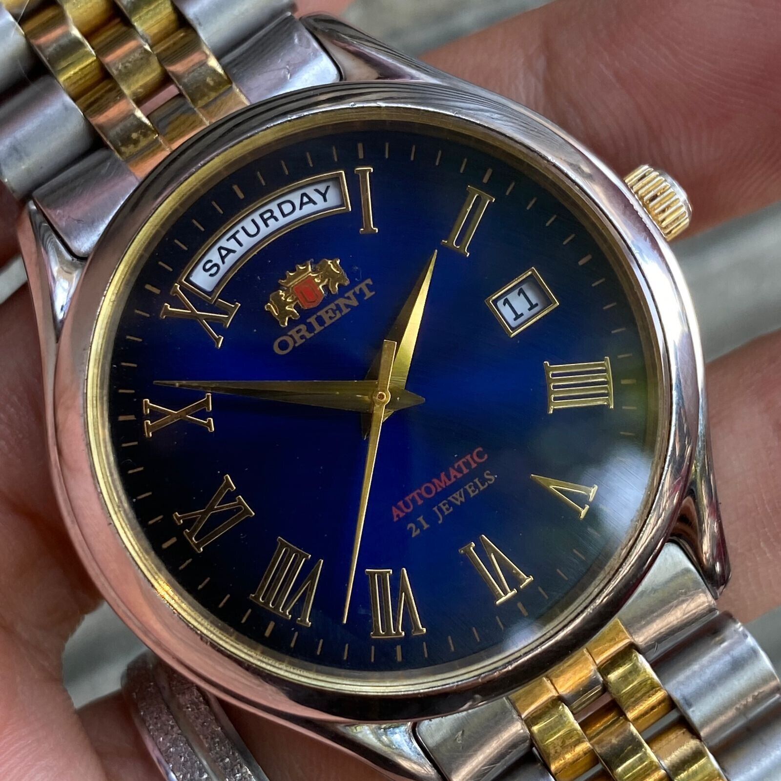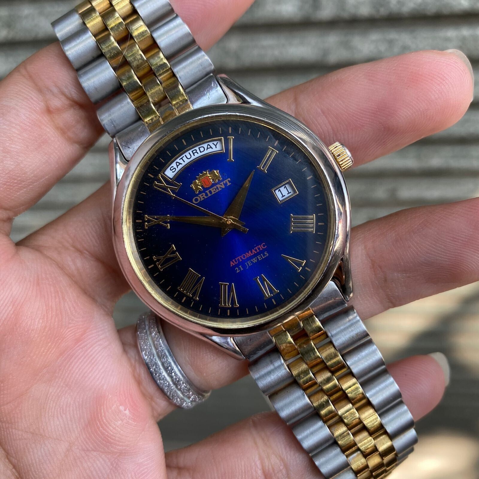 Important Notice for US Customers: Due to new US regulations, all imported items will be subject to import taxes regardless of value. We have no control over customs tax charges and cannot accept complaints regarding these fees. RARE ORIENT President EV0H-A00 CS Day Date Blue Dial Automatic Vintage Watch This Watch is Preowned with Good Conditon Brand : Orient Ref/Model : Orient President Movement : Automatic Dial : Blue Case Material : Steel Crown : Original Bracelet : AM Case Size : 38.6 mm Include Crown Condition : Good ( condition according to photo ) Accessories : Watch Only without Box, Without Papers. Please have a look at photos for detail If you have other questions, please contact us. Shipping , Returns and Sales Terms,: ------------------------------------------- We ship worldwide via Fedex or DHL Express We not accept Return We do combine shipping we not responsibility for Import duties, taxes, and charges , so please check in your country's customs office to determine what these additional costs will be prior to bidding or buying. Please check the item condition and photos carefully before buy or make your bid and Please don't buy/bid if you don't have any intention to buy. Once you make your buy/bid, it means that you are willing to buy it and also willing to pay for the final value and shipping cost. Any condition that is not describe on item's description but shown in photos will be considered as described. Sold As Photo, no return accepted. If you bid and win the auction means that you already understand and accept the item condition as describe above. Listing and template services provided by inkFrog