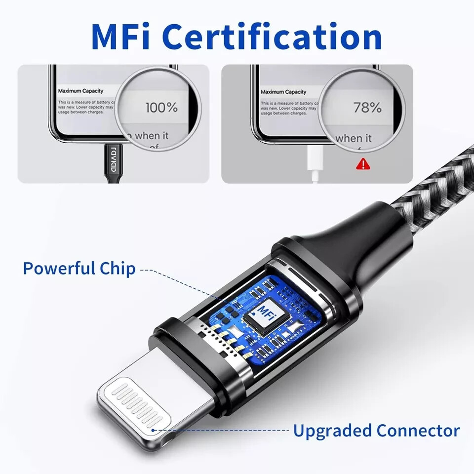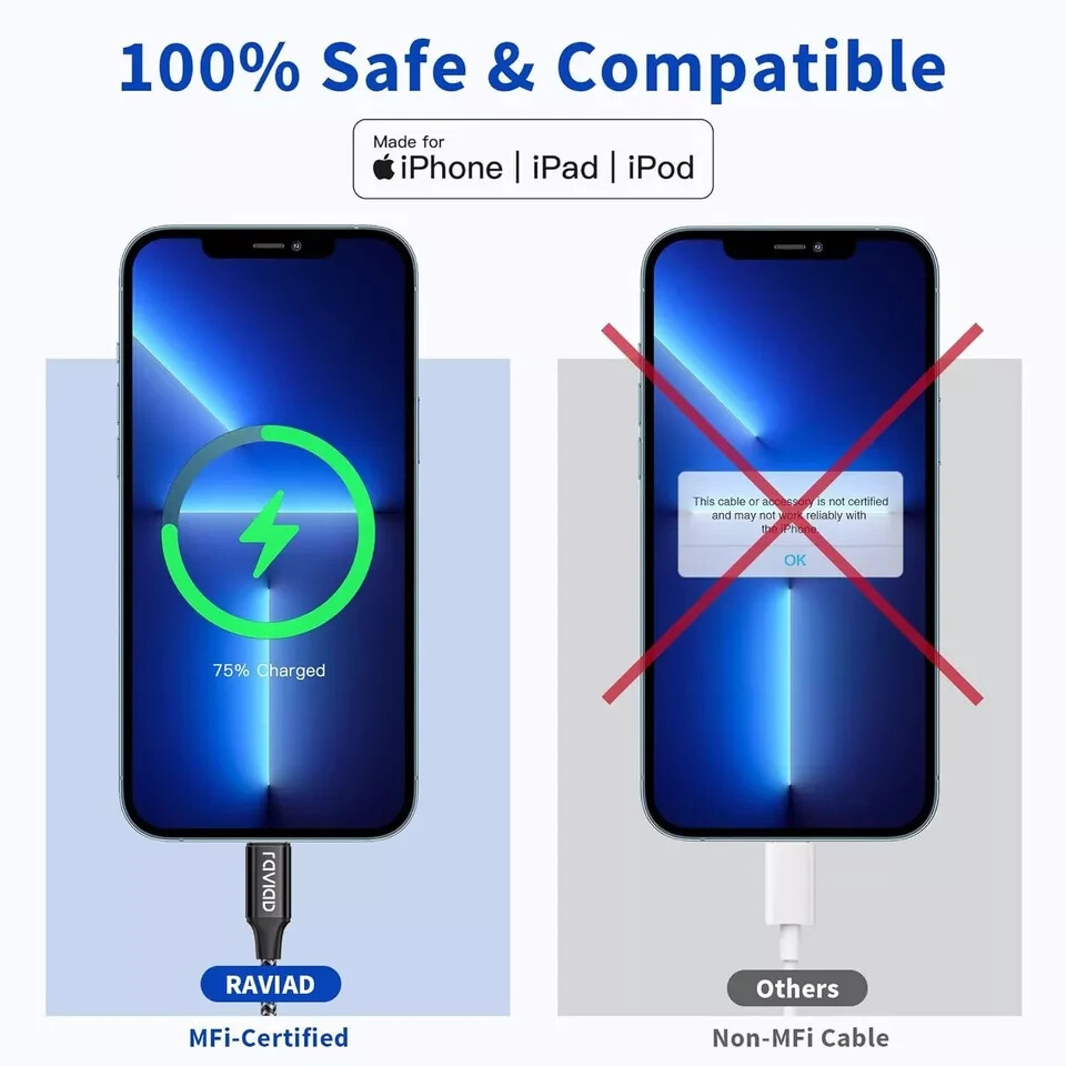 NOTE PLUGS ARE SILVER NOT BLACK AS SEEN IN PHOTOS. RAVIAD iPhone Charger Cable 2M 6FT 4INCHES MFi Certified Nylon Braided Lightning Cable Fast Charging Sync iPhone Charger for iPhone 14 13 12 11 Pro Max 13 12 Mini X XS XR 10 8 8 7 Plus 6 6s 5s 5 Black Product Description Thank you for looking at our current available product which is brand new and ready for quick despatch. [2.4A Fast Charge & Sync]: Equipped with the original terminal and smart MFi chip RAVIAD iPhone Charger supports 2.4A (Max) fast charging to your devices (40% faster than the normal cable). Meanwhile it promises no warning message will pop up and enusres that your iPhone devices are charged safely. [3M Perfect iPhone Cable]: Flexible 3M/9.8FT [ APPROX ] lightning cable is suitable for a wide range of everyday connection requirements whether at home in your car in the office or while traveling. [Built to Last]: This iPhone Charger Cable with premium density nylon outside and high-grade tinned copper wires inside which ensure the durability flexibility and functionality of the cable. It can withstand over 25000+ bending tests without breaking 2.5X stronger than other cables. [Perfect Compatibility] RAVIAD iPhone Lightning Cable works perfectly with iPhone 13 Pro Max iPhone 13 Pro iPhone 13 iPhone 12 Pro Max iPhone 12 Pro iPhone 12 iPhone 11 Pro Max iPhone 11 Pro iPhone11 iPhone XS iPhone XR iPhone X iPhone 8 Plus 8 iPhone 7 Plus 7 iPhone 6 Plus 6 iPhone SE 2020 iPhone SE and more. [Hassle-Free MANUFACTURES Service]: RAVIAD iPhone Fast charger Cable Come with a 24-month warranty and the 24/7 customer service is our commitment to every customer. If you encounter any problem we are always here for you. [ CONTACT RAVIAD only] Manufacturer : RAVIAD Part number : RAVD-001-BW-18 Item Weight : 56 g Product Dimensions : 21 x 14 x 2 cm; 56 g Item model number : RAVD-001-BW-18 Size : 3M Colour : Black/SILVER MIXED Shape : Round Wattage : 20 watts Amperage Capacity : 4 Amps Item Package Quantity : 1 Special Features : Fast charging Nylon Braided Batteries included? : No Batteries Required? : No Brand : RAVIAD Connector type : Lightning Cable type : Lightning Compatible devices : Charging Adapter Special feature : Fast charging Nylon Braided please read my INPORTANT history, all these new items are part of my other 2 ebay sites royroyroy6 or shop name [ cave of all sorts of bits and bobs] and royroy2008 or shop name [ mostly all you need in one place ] or other new site [ cablesc_19 ] with a combined sales of over 4.400 sold, been on ebay for over 14 years, with many years of excellent feedback 99.8%. now selling at cost or a loss, due to severe illness ty. NOTE sent NEXT WORKING day, via royal mail 2nd class, normally 2/3 days, on very rare occasions 4/5 working days . sent 2nd class, some SIGN FOR COSTING me £3.25 NOTE THIS ITEM IS new , IN ORIGINAL pack [ Cable only ], it has been individually factory, checked/ tested, [ AND now discreetly photo ID SECURITY MARKED ]. NO RETURNS UNLESS FAULTY. ID 983B