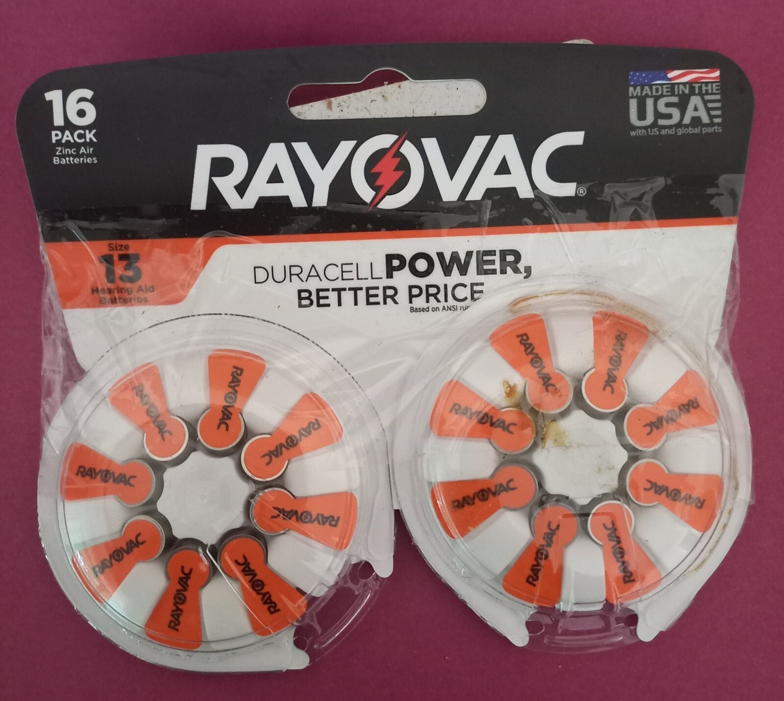 32 pack of Rayovac Size 13 Hearing Aid Batteries to power your listening device Duracell hearing power, budget friendly price Certified Child Resistant packaging* Rayovac hearing aid batteries have longer battery tabs that are easier to grab Batteries won’t swell, leak, or damage devices Recyclable packaging Rayovac size 13 hearing aid batteries hold power for up to 4 years in storage Good price!