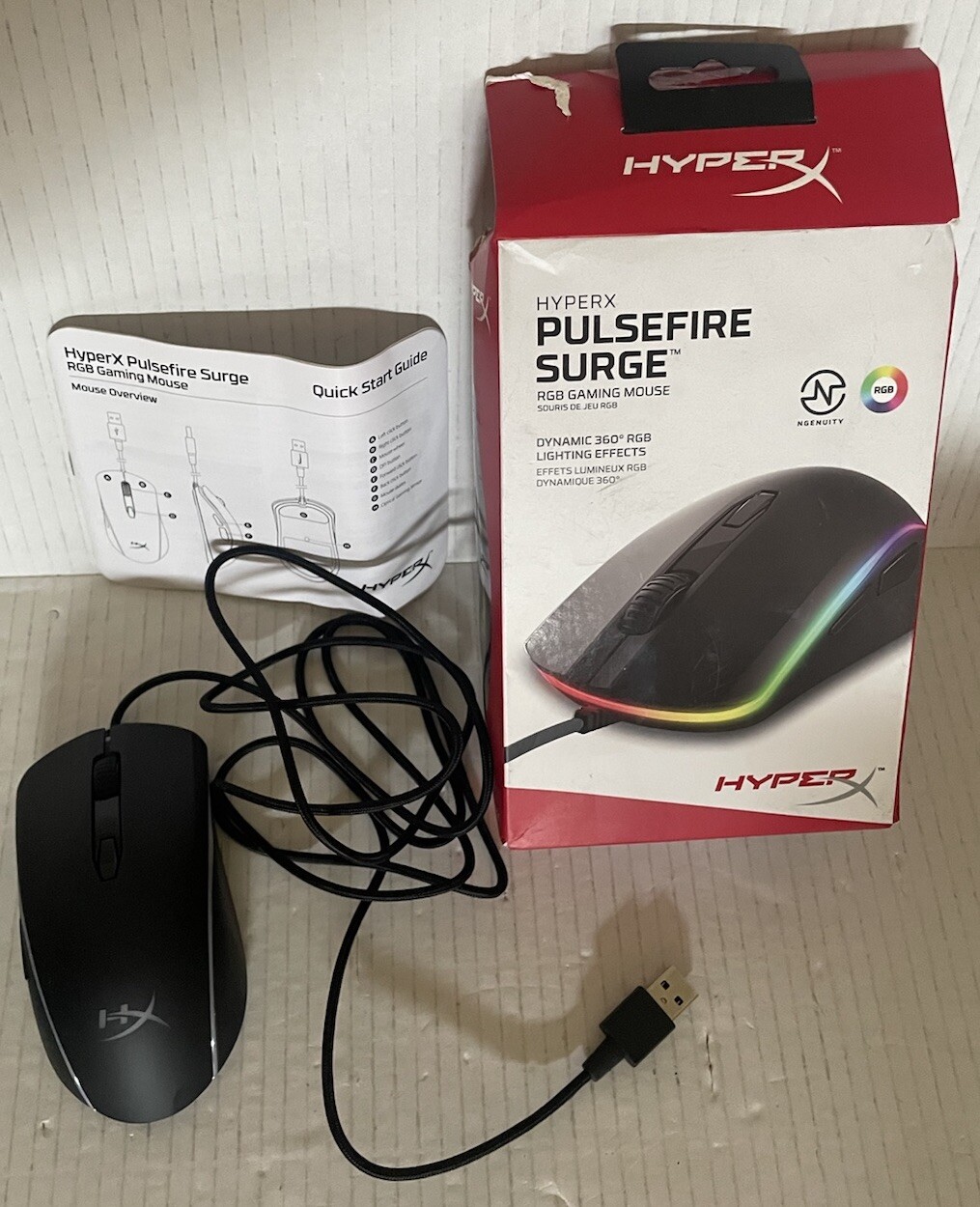 RGB Gaming Mouse. Says Hyper X Pulse Fire Surge RGB Gaming Mouse / HX-MC002B. Box may have wear, tear and/or stickers - see pictures for reference.