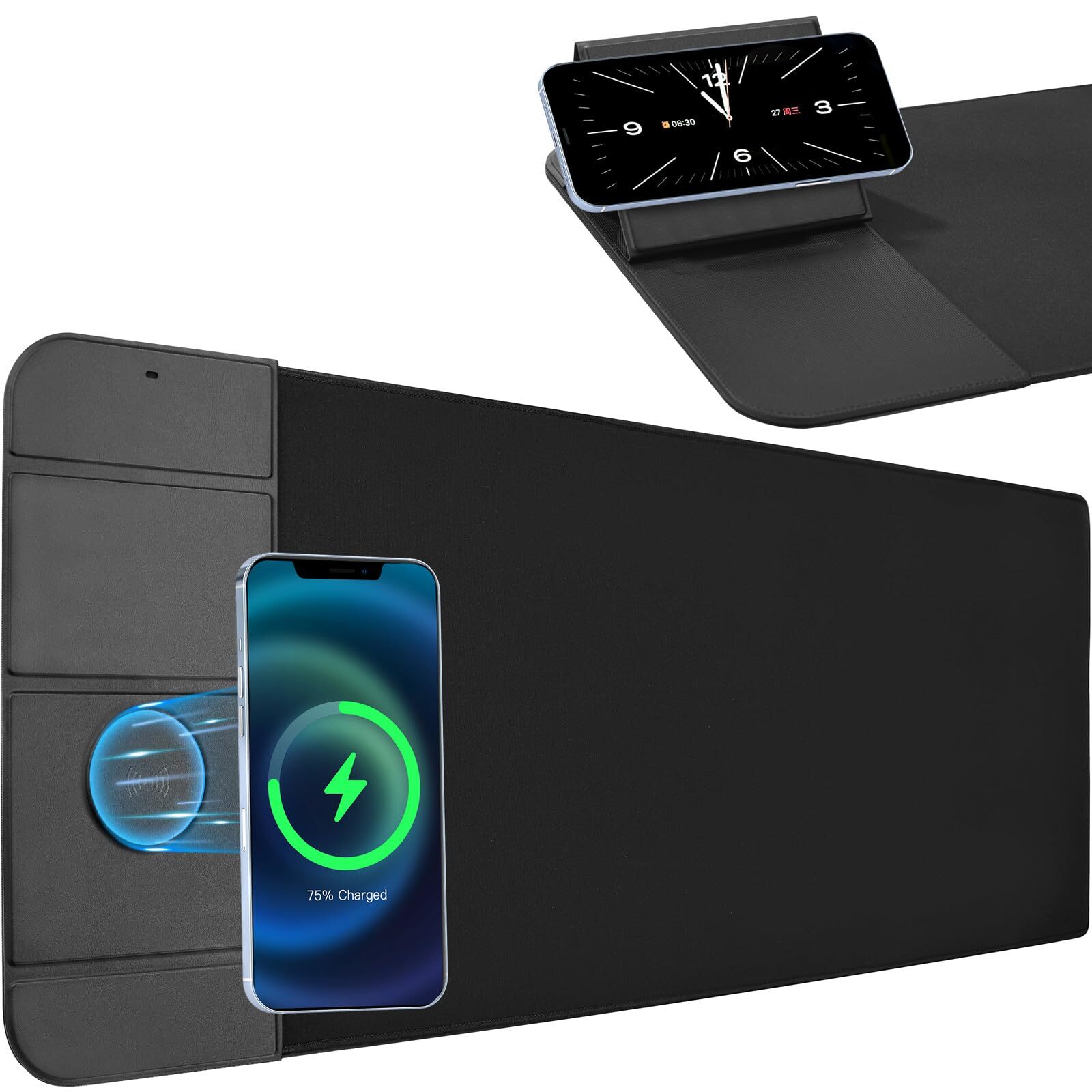 【15W Wireless Charging Mouse Mat】Keyboard mat 15W wireless fast charging compatible with smartphones which support wireless charging such as iPhone/11 Pro/12/12 Pro/12 pro max/13/13 Pro/13-14 15 pro max, Samsung Galaxy 10/S9/S8 Plus, Galaxy Note 9/8, and all other Qi-enabled devices. 3 charging modes indicator - RED for charging, GREEN for full charged. (NOTE: 10W need power adapter 9V 2A,But power adapter is not included with this Mouse Pad) 【Charging Mat Foldable phone holder】Gaming mouse pad with magnetic magic suction charging is more stable also can be foldable into mobile phone holder. 【 Gaming Mouse Pad XXL】 Wireless charging mouse pad large Size 800x300x40mm mousepad provides a larger usable area to cover keyboard, mouse and other stuffs on the desktop when playing games or office work. At the same time, this mouse pad can protect your desk 【Adjustable charging board design】Computer mat charger with 15W Qi quick-charge panel,you can easily and quickly charge your mobile phone while you are playing or working. 【Non-slip Mouse Pad with 4mm thick】Keyboard pad offers ultra smooth surface, accurate and controllable surface. Provides the optimal surface for gaming sensors and less resistance than other mouse pads. Offers a fast and smooth tracking surface for your mouse. Raised your gaming experience to the higher level.With anti-slip base, this mouse pad keeps super firmly on the desk and provides heavy grip.
