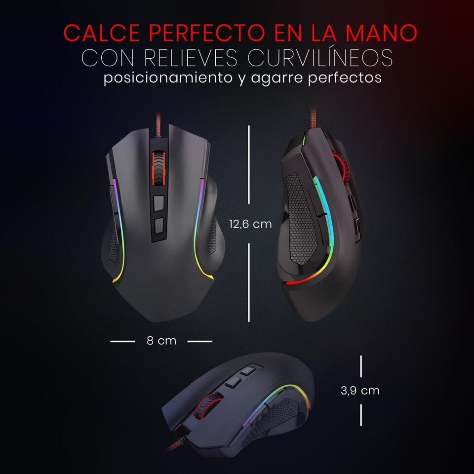 About this item: WIRED GAMING MOUSE; built for Gaming Computers - Ergonomic M602-RGB “Griffin” RGB Backlit Gaming PC Mouse up to 7200 DPI (user adjustable 800/1200/1600/2400/7200 DPI), 10G acceleration. The High-Precision Sensor delivers Pinpoint Accuracy while the Gaming Grade Micro Switches ensure longevity, greater durability and extreme responsiveness, giving you an even greater edge over your competition RGB BACKLIT MMO PROGRAMMABLE PC GAMING MOUSE; 7 MMO user programmable buttons, 5 Memory Profiles each with distinct LED color option for quick identification. 7 different backlight modes. (Backlight can be disabled) The M602-RGB Gaming Mouse offers you total personalization for your Gaming Computer and Gaming Laptop ERGONOMIC GAMER MOUSE; Delivering an extremely comfortable and precise experience for Computer Games. The ergonomic shape of the Redragon M602-RGB PC Gaming Mouse is built for comfort, fits naturally in your hand, the buttons are tuned to reduce click fatigue HIGH-END PC GAMING MOUSE FEATURES; The M602-RGB Mouse features; Built-in Weight Tuning for the right balance, Anti-Skid Scroll Wheel, Durable smooth TEFLON feet pads for ultimate gaming control. 7 programmable buttons. Total 8 buttons. The Mouse works great with Gaming Mousepads & Keyboards. Comes with 6 foot, 3mm strong high-speed braided fiber cable and a gold-plated corrosion free USB connector for a reliable connection PC GAMING MOUSE COMPATIBILITY: Windows 10, Windows 8, Windows 7, Windows Vista, or Windows XP, Limited Mac OS support Works well with all major Gaming Computers Brands and Gaming Laptops Product Description: Product Dimensions: 4.92 x 2.87 x 1.57 inches Item Weight: 4.6 ounces Item model number: M602 Is Discontinued By Manufacturer: No Color Black Connectivity Technology USB Special Feature Programmable Buttons, LED Lights Movement Detection Technology Optical