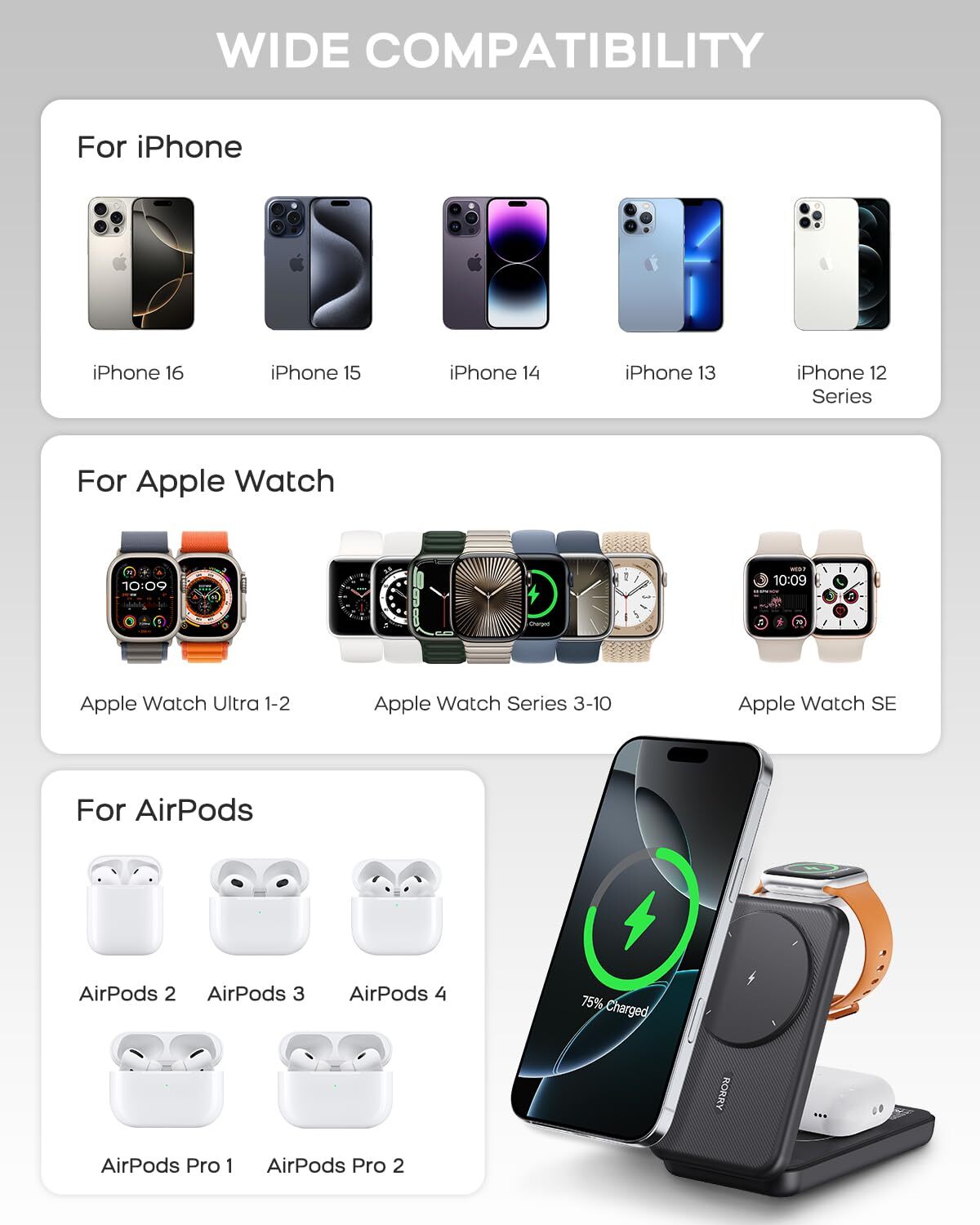 3-in-1 Charging Station for Apple Family: RORRY portable charger station combines a 10,000mAh power bank and a 3 in 1 charging station, which is compact and travel-friendly. The magnetic wireless portable charger is compatible with iPhone 16/15/14/13/12 Plus/Pro/Pro Max, for Apple Watch Ultra 2/Ultra/Series 10/9/8/7/6/5/4, for AirPods 4/3/2/Pro/Pro 2, and more. 10,000mAh Capacity Power Anywhere: With a capacity of 10,000mAh, this portable charger station is perfect for short trips. It can fully charge for iPhone 16 Pro up to 1.8 times or for Apple Watch Series 9 up to 17-20 times, for AirPods Pro up to 10-12 times, ensuring you stay powered wherever you go! Fast Charging Portable Charger: Takes just 30 minutes to charge for iPhone 16 Pro up to 56%, and 3.5 hours to fully recharge the power bank via the PD 20W USB-C port. Fully charge for iPhone, for Apple Watch, and for AirPods at the same time in just 2-3 hours. Wake up to fully powered devices, ready to go! Foldable and Travel-Friendly: This foldable 3-in-1 for MagSafe portable charger fits effortlessly in your purse or pocket, replacing tangled cords and bulky chargers. Whether you’re traveling or on a business trip, it powers all your devices while taking up minimal space, making it the perfect all-in-one travel accessories. Hall Effect Magnetic & Safety: The RORRY portable charger has a Hall effect magnetic switch that turns on when flipped up, saving energy and extending battery life. It features smart microchips for protection against short circuits, overheating, and overcharging, while its premium PC hard shell offer excellent resistance to pressure and scratches. Please note: To ensure the portable charger can charge multiple devices simultaneously while itself being charged, please use an adapter that supports more than 20W for optimal performance. Using an adapter with less than 20W may prevent the portable charger from charging other devices while it is charging.(Product does not support simultaneous charging of 4 devices.)