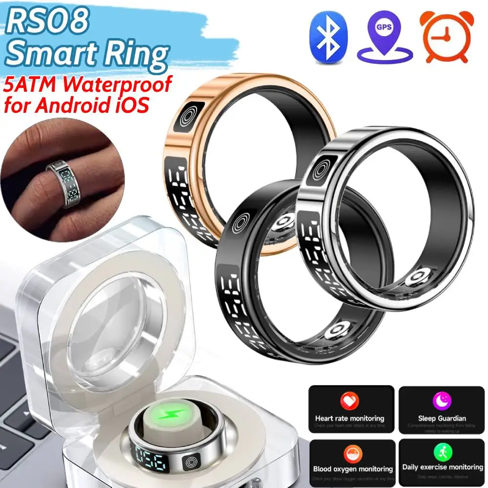 RS08 Smart Ring 5ATM Waterproof Health Fitness Rings Multi-sport Modes Sport Health Ring Bluetooth-Compatible 5.1 Heart Rate Blood Oxygen Sleep Monitoring for Men Women for Android iOS Feature: 1. Versatile Smart Ring: This smart ring supports multiple sports modes and provides real-time heart rate monitoring. Simply tap to display your last reading and initiate new tests, making it an essential companion for fitness enthusiasts. 2. Comprehensive Health Monitor: With advanced features like sleep tracking and blood oxygen measurement, this health monitor offers detailed insights into your well-being. Tap to view sleep duration and blood oxygen levels, ensuring you stay informed about your health. 3. Innovative Health Fitness Rings: These health fitness rings seamlessly integrate for WeChat and Apple Health, allowing you to track your steps and sync with your favorite health apps. Enjoy multilingual app support for a personalized fitness journey. 4. Dynamic Sport Health Ring: Experience the future of interaction with this sport health ring, which enables gesture controls for TikTok and other apps. Effortlessly browse videos, scroll pages, and shop online without touching your phone screen. 5. Convenient Sleep Ring: Capture perfect moments with the sleep ring's remote photo-taking feature. A simple gesture triggers the camera, allowing you to take stunning selfies and photos with ease, elevating your photography experience. Specification: Origin: Mainland China Size:Size: 8 (inner diameter 18.2mm), 9 (inner diameter 19.0mm), 10 (inner diameter 19.9mm), 11 (inner diameter 20.7mm), 12 (inner diameter 21.5mm) Thickness: 2.5mm Weight: about 3.4g Waterproof: 5ATM waterproof, can be worn for diving or snorkeling, supports waterproof depth of more than 50 meters" Material: stainless steel + glue filling process Main chip model: German Dialog DA14585) - ultra-low power consumption Body storage capacity (ROM+RAM): 128kb ROM + 96 Kb RAM Sensor: SC7A20 Bluetooth-Compatible version: 5.1 Support APP-side GPS data: Yes Heart rate sensor model: Tianyi 3918 Battery type: polymer pure cobalt battery Working temperature: 0-50℃ Battery capacity: 18mah Charging time: 2 hours Theoretical standby time: 16 days-20 days Usage time: 3 days-4 days Compatibility: Support Android 9.0 and above; Apple IOS 10.0 and above Compatible software: Jring Support OTA (OTA upgrade): Support Fota upgrade APP: Jring Packaging size: 83*82*28.5mm Gross weight: 65g Note: The charging case is not included! Note: Due to different monitor settings and lighting conditions, the actual color of the item may vary slightly from the pictures. Thanks for your understanding! Please allow a 1-2 cm difference in measurements due to manual measuring. 1 X Smart Ring 1 X Charging Cable 1 X Instruction Manual .