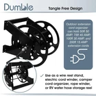 [Organize Your RV Storage Compartment]: RVs have limited space for storage; Optimize your camper basement when you use the Dumble RV Supplies Master Extension Cord Roller Reel [Tangle Free Design]: Extension cord storage reel uses a 4.6-inch (11.7cm) long handle that allows you to swiftly wrap your extension cord up without tangling or twisting [Fits Your Needs]: Use as a wire reel stand, electric cord winder, camper cord organizer, rope winder, or RV water hose storage reel; Outdoor extension cord organizer can hold 50ft 50 AMP, 75ft 40 AMP, 100ft 30 AMP, and 200ft 15 AMP extension cords [Built to Last]: Premium steel construction ensures a secure base and a heavy load capacity to stand up to any electrical cords you intend to store on this RV power cord reel; Includes assembly hardware [Stability You Can Trust]: When assembled, this extension cord holder organizer stands 17 inches (43.2cm) tall and has a foot stance of 12.6 by 13.4 inches (32 x 34cm); When handle is folded inward, drop cord reel system measures 14.3 inches (36.3cm) wide by 15 inches (38.1cm) long