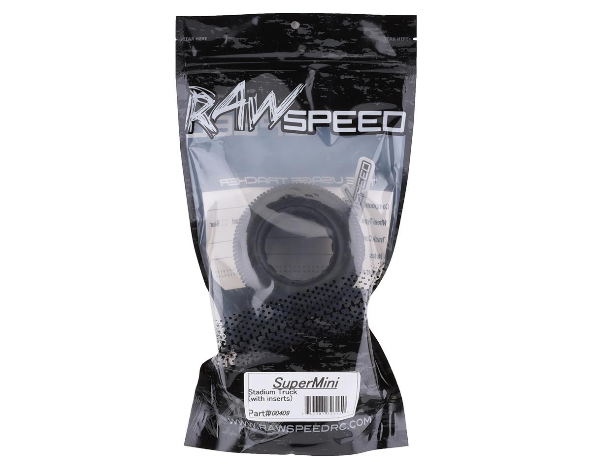Raw Speed RC SuperMini 1/10 Stadium Truck Tires fit industry standard 2.2 inch buggy wheels and include closed cell inserts. Tires are available in soft, soft-long wear, super soft, super soft-long wear and medium compounds. Package includes two tires with closed cell foams. About Us | View Store