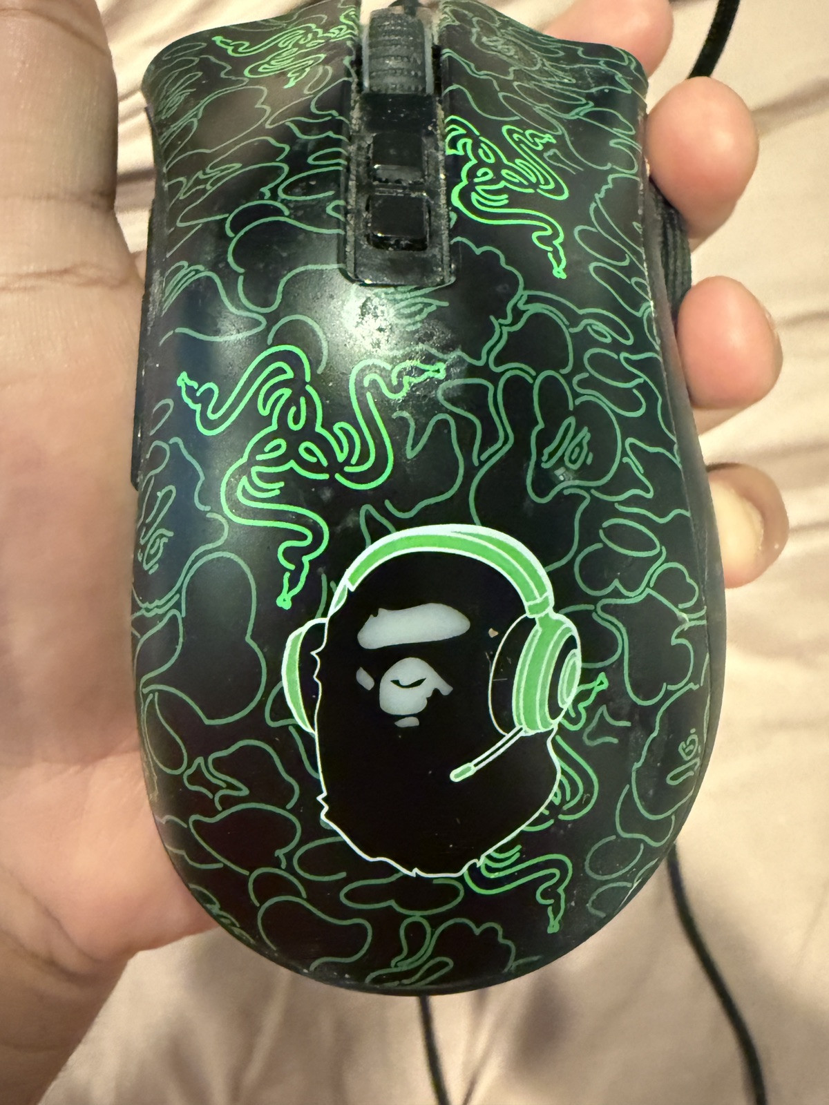 The Razer DeathAdder V2 Gaming Mouse is a black, wired gaming mouse featuring programmable buttons, an ergonomic design with grip, a thumb button, a scroll wheel, and LED lighting. It offers precise tracking with an optical sensor, making it a popular choice for gamers. NO BOX.