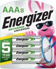 8 pack of Energizer Recharge Universal Rechargeable AAA Batteries Energizer AAA batteries offer up to a 5 year battery life for long lasting AAA cell batteries Energizer rechargeable batteries reduce waste and save money when used with an Energizer Battery Charger with 4 AAA batteries to meet your needs NiMH AAA batteries made with 15% recycled materials and chargeable batteries are designed to prevent leaks Use AAA rechargeable batteries in all types of devices for convenient AAA rechargeable battery use with less waste Triple A batteries in this AAA battery pack can be charged hundreds of times Energizer Recharge Universal Rechargeable AAA Batteries help you reduce your environmental impact. The AAA rechargeable batteries use innovative technology to provide a lasting charge. Using these rechargeable AAA cell batteries creates less waste and offers convenient power. Use Energizer rechargeable batteries inside wireless gaming components, flashlights, computer mice and more. The Energizer AAA batteries come pre-charged and can be charged hundreds of times. These leak proof triple A batteries hold a charge for up to 12 months in storage. Energizer is the world's number 1 rechargeable brand.