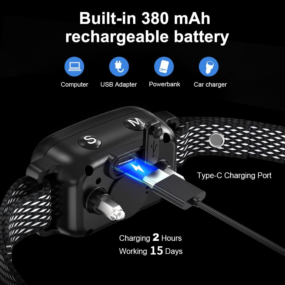 【More effective, Humanized and Safer】: Smart Bark Collar has 5 working modes, 7 adjustable sensitivities and 9 adjustable vibration intensities. No vibration mode: beep, vibration, beep + vibration; vibration mode: vibration, beep + vibration + vibration. The different training modes and adjustable sensitivities provide the most appropriate training method and use progressive training levels to provide positive strong effects for good behavior. 【Adjustable Stop Bark Collar】:stop bark collar size is adjustable. Suitable for dogs from 8 to 120 lbs and neck size from 6 to 28 inches, the collar strap is made of skin-friendly soft weave with IP67 waterproof function, your dog can enjoy bathing, swimming, chasing toys around the pool or playing in the rain! 【Fully automatic anti-bark protection mode】:Smart Bark Collar has a safety shut-off function, if it is triggered 6 times in a row, it will temporarily stop working for 1 minute, pressing any button will resume working. The bark collar is fully automatic to stop annoying barking at night or when you are away. Enjoy a peaceful environment for you and your neighbors. 【Technology upgrade, intelligent anti-interference】: Smart Bark Collar uses an advanced identification chip and motion detection technology that activates only when vocal vibrations and barking are detected, safely and effectively filtering out other dog's barking, preventing false triggers and protecting your dog from unwanted punishment. 【Fast charging and long lasting】:Bark Collar has a built-in 380mAh rechargeable battery and with the use of a common USB C-type charging cable (included), the anti-bark collar can be recharged in just 2 hours and lasts for up to 30 days. Intuitive LED color interface shows battery level and low battery alert for easy use. 【Professional assistance】If you have any questions, please feel free to contact through Amazon message center - we promise to always provide satisfactory solutions and technical guidance!