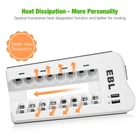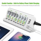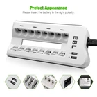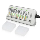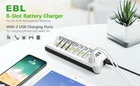 # For AAA AA Batteries # Specification: Voltage: 1.2V Capacity: AAA 1100mAh/AA 2800mAh Battery type: AAA R03/ AA R6 Chemical Composition: Ni-MH Doesn't contain Hg/Cd/Pb, no pollution to the environment. Feature: * 100% Brand new and high quality * It is 4 in 1 EBL AA AAA rechargeable NI-MH replacement battery * The latest lock electric technology are adopted * Nimh environmental protection material * Rechargeable battery, up to 1000 recharge cycles * Excellent high discharge/drain performance * Exact replacement for standard AA AAA size batteries * Superior performance under low temperature condition * Longer in high drain devices than Alkaline batteries * Can be commonly usedd for for high power demend devices such as Digital Cameras, CD Players, Remote Control Vehicles, Metal Detectors, PocketFlashlights, PDAs Palm Pilots, Pagers, Game Boys, Children's Toys, etc # For charger # Features: Upgraded Charger (EBL 808U) for EBL 808, individual and smart, could freely charge 2/4/6/8 AA AAA Ni-MH Ni-CD rechargeable batteries. 2 USB Ports, special dual USB design will be better for charging your smartphones or tablet while charging batteries, space saving. Controlled by MCU, automatically stop charging when detecting improper input voltage, defective or short circuit or non rechargeable batteries. Lighter & Smarter - 808U Battery charger Only 168g, the 808U is lighter than its previous version EBL 808 battery charger; The 808U upgraded with 2 USB output ports that can charge 2 USB devices, like a smartphone and a tablet simultaneously. Widely Compatible - More Convenient 1. Freely charge 2/4/6/8 AA AAA Ni-MH Ni-CD rechargeable batteries; 2. Support to charge your 2 different phones or 1 tablet while charging batteries. Dual - USB Ports Dual-USB Ports Design It Supports to charge your 2 different phones or 1 tablet and 1 phone while charging batteries. Save your time to find a USB Ports with this charger Note: Please do not charge alkaline or lithium batteries. Specifications: Input: 100-240V AC MAX: 4A Output: 2.4V DC 180mA USB Output: 5V/1.0A 5V/2.1A USB Output reach up to 20W No Load Power Consumption: 1W MAX Full Load power consumption: 28W MAX Battery Charge Rate: >90% Size: 7.2 x 3.7 x1.1 inch Weight: 5.9 oz Packages Included: 1 x EBL 808U Battery Charger 4 x 2800mAh Rechargeable AA Batteries 4 x 1100mAh Rechargeable AAA Batteries 1 x User Manual 1 x AC Power Cable