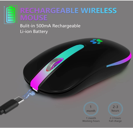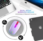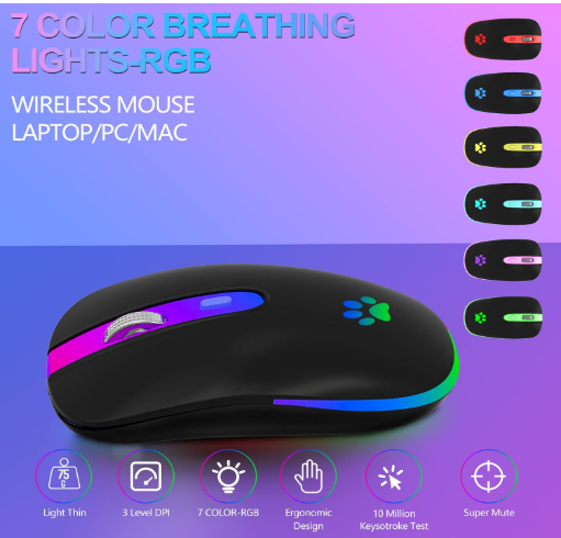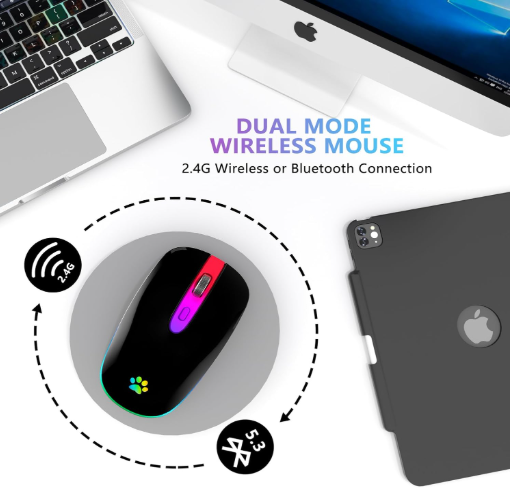 Dual Mode: The dual mode (BT5.2/3.0+2.4G) of this wireless mouse enables free switching between the two devices; When the wireless mouse Bluetooth button switch is in 2.4G mode, you can use the 2.4G wireless mouse, or connect your laptop's Bluetooth to use the Bluetooth mouse, Plug and Play; Note: You can't use Bluetooth mode and 2.4G mode at the same time Wide compatibility: 2.4GHz mode is suitable for laptops, desktops or any devices with USB ports, just plug in the USB mouse receiver and use it directly. Wireless Mouse Bluetooth mode for Windows/Android/MAC OS system. Note: BT5.1 system requirements: Windows 8.0, Windows 10 or higher; MacOSX 10.10 or higher; iPad OS 13 or higher/Android 5.0 or higher Slim Compact Design, Travel Friendly: Ergonomically designed wireless mouse for laptops for greater portability and better travelling experience 3 Adjustable DPI Values: 1600, 1200, 1000 resolution Optical tracking technology provides sensitivity and precise tracking on a wide range of surfaces; The wireless mouse Meet your multiple needs, either for daily work or gaming Colorful Light: With 7 different colours that automatically breathe and switch, the unique cat's paw design of the LED wireless mouse provides soothing light and creates a pleasant atmosphere for work and play, note that the LED colours cannot be fixed