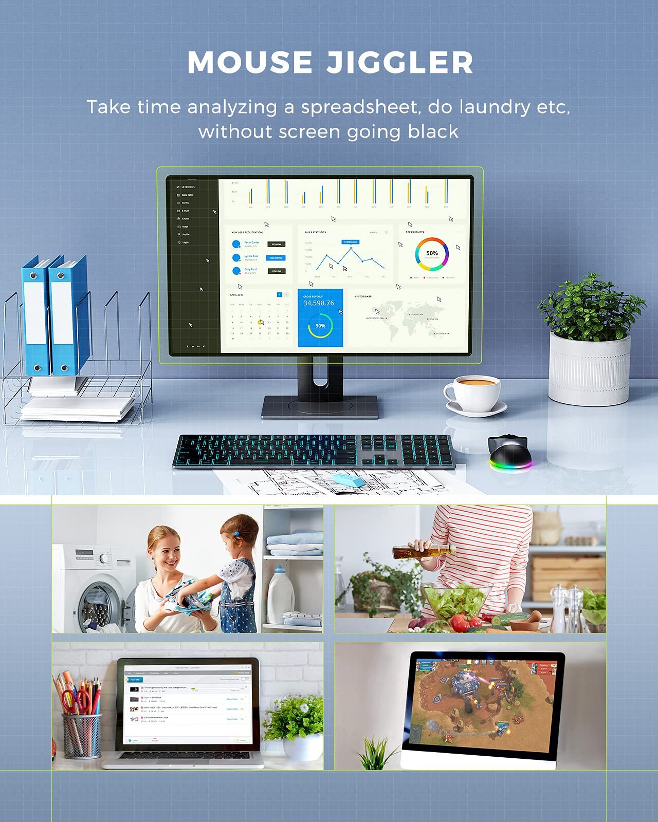 Keeps computer from locking automatically If you have a computer that signs you out after no activity of few minutes and you are tired of having to log back in, this led mouse featuring with Jiggler mouse mode does the trick. PC stays logged in all day until you ready to turn it off. If you work from home, then you definitely need this in your life! How to Use it: For Wireless Mouse: >> Turn the power switch on; >> Pull out the USB receiver and plug it to your computer; >> The mouse is ready! (Press the led control button to choose your favorite light). For Jiggler Mouse: >> Press the DPI button for 3 seconds; >> The green light on, entering “Jiggler Mouse” mode; >> Enjoy the “Jiggler”, no more screen sleeping >> You can press the DPI button for 3 seconds again to exit “Mouse Mover” mode Bonus: The jiggler mouse keeps your PC active but don't interfere with using it, you can control the mouse cursor, and it will back to jiggler mode again if no movement of the mouse for 5 seconds. Please Kindly Note: 1.The mouse will turn to sleep mode in 90 seconds of inactivity, the LED backlit for mouse will turn off automatically, and you can wake it up by clicking any buttons; 2.The mouse will turn to deep sleep mode in 8 minutes of inactivity, the ALL LED indicator will turn off automatically, and you can wake it up by clicking any buttons; 3.In “Mouse Jiggler” mode, the cursor won’t stop moving even if the mouse enters deep sleep mode, only if you press and hold the DPI button for 3 seconds to exit the “Mouse Jiggler” Mode; 4.If mouse lags or the backlit turn off automatically while using, pls recharge the mouse (The RGB backlit will flash red under low battery) Mouse Jiggler & Rechargeable LED Mouse 2 in 1 Design -- If you are doing your work on the computer, this would be a actual mouse with amazing LED colors, if you're not typing away or step away from your computer, this would be a Mouse mover which give you a little breathing room without having to worry about logging back into all your programs again(You will have to press the DPI button for 3 seconds to enter into jiggler mode) Random Movements & No Interfere with using Mouse -- The mouse produces random movements on the screen and it is very quiet in Jiggler Mode, when you back to the computer, no need to draw attention to the fact that you're using a jiggler, the cursor is under your control! It will enter Jiggler mode again after 5 seconds of inactivity Plug & Play Perfect for Laptops Only with Limited USB Port -- There is virtually no set up, you literally just plug it in and turn on the switch it works! Only 1 real mouse will be plugged in your computer, so no worries if you use using it with your laptop that only has 1 or 2 USB ports, and not bother to buy an adapter Separate On/Off Control for the Mouse and Jiggler Mode -- It serves its purpose and can be turned on and off, gives you simple and effective control, so you don’t have to plug it in and unplug it, cause not all the time you will need to run it Universal Compatibility & Risk Free 12 Months -- Compatible with almost all USB-enabled Computers run of Windows XP, Windows 7, Windows 8, Windows 10, Mac OS. And this mouse is backed by 12-months , just let us know if you have any issues with the mouse ordered.