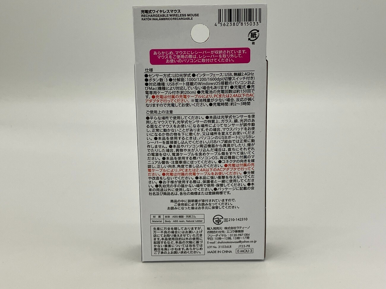 Description This wireless mouse is a great addition to your workstation. The rechargeable battery allows for long periods of uninterrupted use. This mouse is compatible with both Win and Mac OS and has a silent click function, making it ideal for use in quiet environments. This mouse is manufactured by DAISO and has three buttons. It is black in color and made in China. The connection is wireless, making it easy to use and it also has a silent click function. This standard mouse is perfect for anyone who needs a reliable and efficient wireless mouse. Specifications ●Sensor type: LED optical type ●Interface: USB, wireless 2.4GHz ●Resolution: 1000/1200/1600dpi ●Compatible models: PCs and Macs with Windows OS equipped with USB ports ●Comes with a dedicated charging cable (approx. 20 cm) ●Charging time: Approximately 2 to 3 hours Payment We accept Managed Payment . Payment is due within 3 days of purchase. We will ship the item 5business days after your payment clears. Shipping I send a product by Air-Mail . Please bid it without worrying Shipping is available from Monday to Friday. Weekends are not available because post office is closed. International Buyers Please Note : Import duties, taxes, and charges are not included in the item price or shipping cost. These charges are the buyer's responsibility. Please check with your country's customs office to determine what these additional costs will be prior to bidding or buying.
