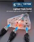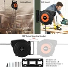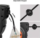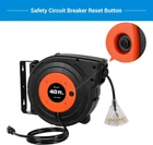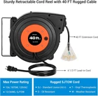 【 12AWG/3C Gauge 40 FT Cord 】 Rated for 15A/ 125V/ 1875W, the heavy duty electric cord reel power station has a triple outlet capacity with a indicator light, convenient for those hard to see areas; 40 feet long extension cord and 4.5 feet lead-in cord 【 SJTOW Cord Resistant to Oil and Water 】 Special type of PVC (SJTOW) cord is tangle-free and resistant to UV light, ozone, water, oil and acid that you may find in a typical garage; also weather resistant and keeping flexible in low temperatures; for indoor or dry-location use only 【 Automatic Retractable 】 With a clever auto-guide rewind mechanism to avoid kinks and tangles, the power cord reel will retract quickly and smoothly; the ratcheting system will lock the cord at any length; cord reel also comes with an adjustable stopper 【 Swivel Bracket for Wall / Ceiling Mount 】 180 degree swivel mounting bracket allows you to easily pull and release cord from multiple directions; the retractable cord reel can be mounted on the wall or ceiling easily 【 Build-in 15A Circuit Breaker 】 Built-in 15A circuit breaker protects devices against short circuit and overloads which will automatically cut off power supply when the total current of the connected devices exceeds 15A; press the reset button to continue using after the cutting off; certified to UL
