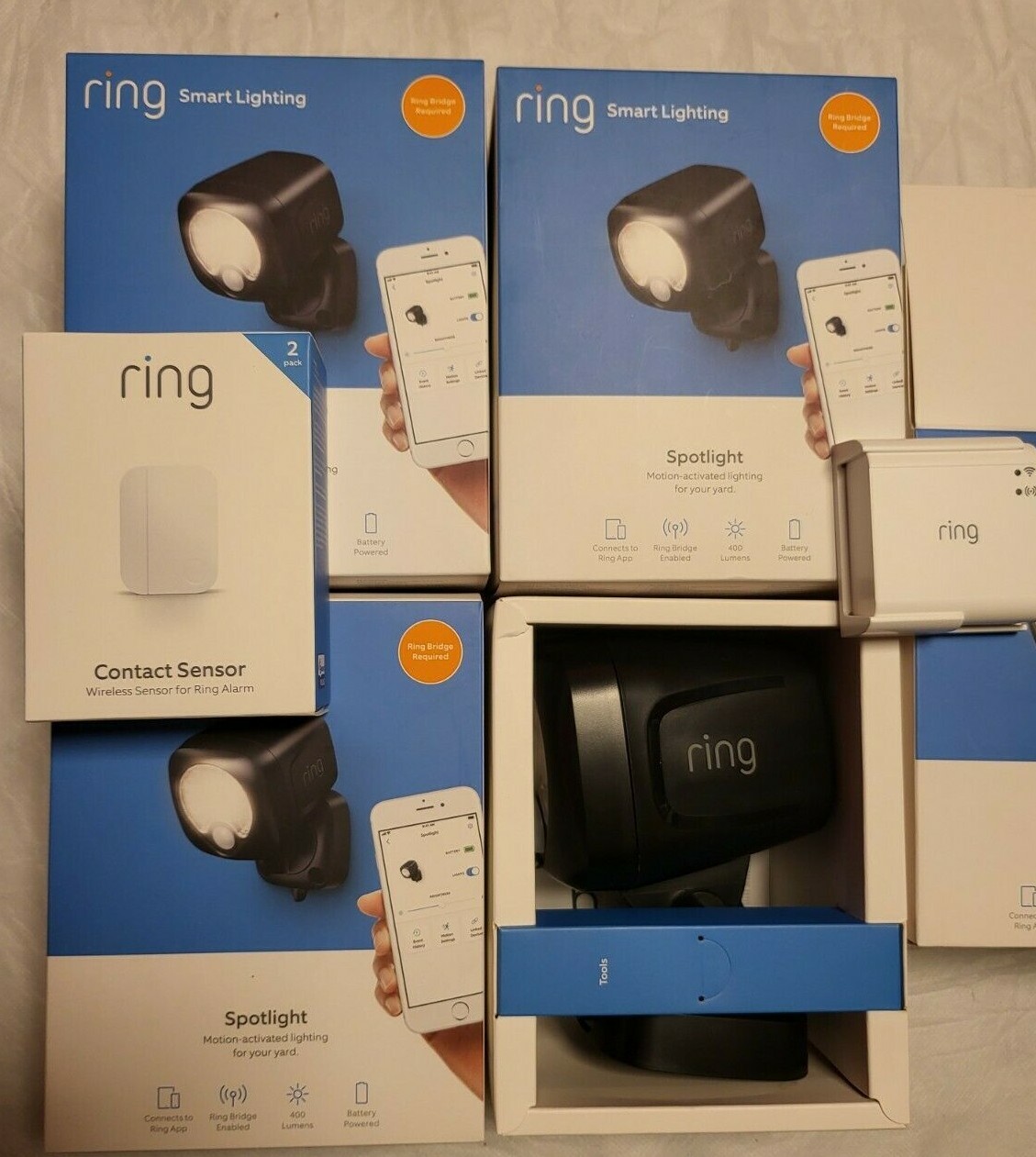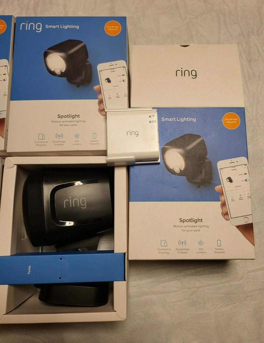 Ring Smart Lighting Products for sale used/new as lot.. Please see pictures for more details. Spotlight Battery - 4pk & Contact Senor 2pk. As seen on pic one spotlight box was open and i am including the bridge and mount as bonus. NEW/USED - Ring Battery Products Ring Battery products included in lot for sale. 1. Ring smart lighting bridge 1 -Used 2. Ring Contact sensor 2pk - New 3. Ring spotlight 2 used no box. 4. Path light 2 used no box 5. Ring smart lighting spotlight 4 new in box 6. Ring outdoor floodlight motion sensor security cam 2 used no box 7. Ring doorbell pro - Used - no box Battery-powered Spotlight that shines light on garages, sheds, porches and other areas when motion is detected. Connect Spotlight to the Ring Bridge to enable smart controls in the Ring App and sync with other Ring Smart Lights, Ring doorbells and cameras, and select Alexa-enabled devices. *Requires Ring Bridge for smart controls. Sold separately. One Ring Bridge supported per household. ** Batteries not included Brighten up your blindspots. Shine a light on your garage, shed, porch, trees and more with compact and convenient Spotlights that go almost anywhere. Then connect them to the Ring Bridge to unlock countless combinations and commands. Motion Activated Turn on Ring Smart Lights and get notifications when motion is detected. Bright LEDs Shine 400 lumens of brightness on important areas at home. Battery Powered Enjoy up to a year of light on one set of batteries under normal use.* Weather Resistant Place it almost anywhere for the ultimate outdoor lighting solution. Make brilliant connections. Link Ring Smart Lights to Ring doorbells and cameras, and select Alexa-enabled devices with the Ring Bridge. Then create combinations to get the most out of your home security. If one connected Ring Smart Light detects motion, it can activate your entire Ring of Security. Lights on in minutes. Use our included toolkit to get the lights up in no time. Simply insert batteries and mount Spotlight in your ideal location for a quick and effective solution. ‘Alexa, turn on the lights.’ Link Ring Smart Lights to the Ring Bridge and connect with select Alexa-enabled devices to activate Ring Smart Lights and adjust settings at the sound of your voice. Plus, Alexa will let you know when motion is detected, so you’ll never miss a thing. It all starts with Ring Bridge Ring Bridge is the hub of your Smart Lighting. It enables smart security features and connects your Ring smart lights with other compatible devices. Group Ring Smart Lighting together to customize how they illuminate. If one light detects motion, it can brighten up a pathway or make your whole yard shine. Connect to select Ring Video Doorbells and Cameras to see what's happening whenever your lights illuminate. Tech Specs Size and Color Dimensions 6.42 in. x 3.82 in. x 4.65 in. (16.3 cm x 9.7 cm x 11.8 cm) Available Colors Black, White Features Motion Detection Adjustable Motion Detection, Up to 120º Field of View. Detection angle dependent on distance from unit. 30’ Range. Power and Connectivity Power 4 D-cell Batteries (not included) Battery *1 Year under normal use (8-10 light activations a day at Level 8 brightness, 20 seconds duration) Battery life is dependent on device settings, usage, and other factors. Brightness may decrease as battery life is depleted. Connectivity Wireless connection to Ring Bridge Auto-Shutoff Time Adjustable (30s to 2m) Installation Average Install Time 5-10 Minutes Operating Conditions -4°F to 122°F (-20°C to 50°C), Weather Resistant (IP66 Rating) Setup Requirements Ring Bridge Required for Use with Other Ring Products One Ring Bridge per household; supports approximately 50 Ring Smart Lighting devices General Box Includes Ring Spotlight, Installation Tools & Screws, User Manual, Security Sticker Warranty 1 year limited warranty
