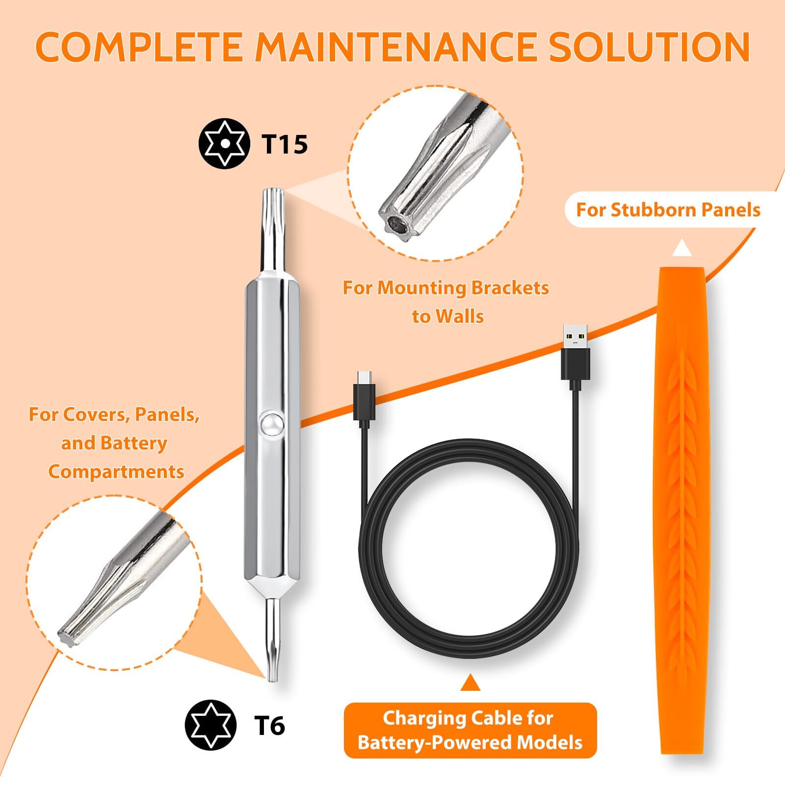 Introducing the ultimate 4-in-1 Ring Doorbell Screwdriver Kit, your go-to solution for all Ring Video Doorbell maintenance needs. This comprehensive toolkit is designed to work seamlessly with ALL Ring Doorbell models, saving you time and hassle. At the heart of this kit is our versatile dual-head screwdriver featuring both T6 and T15 star-shaped bits. The T6 head is perfect for securing doorbell covers, panels, and battery compartments, while the T15 head excels at mounting brackets to walls. This clever design ensures you have the right tool for every Ring doorbell screw, eliminating the need for multiple screwdrivers. We've prioritized user comfort with our ergonomic screwdriver handle, allowing for easy grip and effortless operation during installation or maintenance tasks. The included pry tool is a game-changer for those stubborn, tight-fitting panels that refuse to budge, ensuring you can access your doorbell's internals without damage. For battery-powered Ring Doorbell models, we've included a convenient charging cable, making it easy to keep your device powered up and ready to go. This all-in-one kit truly covers every aspect of Ring Doorbell maintenance. Don't waste time trying to figure out which tools fit your specific Ring model. Our universal kit is compatible with the entire Ring Video Doorbell lineup, giving you peace of mind and saving valuable time during setup and maintenance. Whether you're a new Ring Doorbell owner or a long-time user, this 4-in-1 maintenance kit is an essential addition to your smart home toolkit. Experience the convenience of having all the necessary tools at your fingertips, and keep your Ring Video Doorbell in perfect working condition with ease. UNIVERSAL COMPATIBILITY: This 4-in-1 Ring Doorbell Screwdriver Kit works with ALL Ring Video Doorbell models, ensuring a perfect fit for your maintenance needs. COMPREHENSIVE TOOLKIT: Includes a dual-head T6/T15 screwdriver, ergonomic handle, pry tool for stubborn panels, and charging cable for battery-powered models. PRECISION-ENGINEERED: T6 head secures covers, panels, and battery compartments, while T15 head is ideal for mounting brackets to walls – perfect for all Ring doorbell screws. TIME-SAVING SOLUTION: No need to double-check your Ring model – our versatile kit is designed to meet all disassembly and installation requirements effortlessly. COMPLETE MAINTENANCE SOLUTION: From loosening tight screws to prying open stuck panels and charging batteries, this kit has everything for Ring doorbell upkeep.