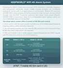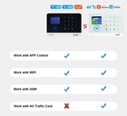 Advantage of 4G alarm system: Australia, United States, Canada has cut the 2G sim card service. And United Kingdom, Mexico, Euro Union, ect will cut the 2G sim card in coming years. Without 2G networks, 2G/GSM only alarm system will fail to achieve it's major function, remote control through calls and SMS. To provide customers with longer alarm system lifespan, our company is launching a series of it's 4G alarm system which are both 4G/3G/2G(GSM) Network compatible. The 4G alarm system will work with United States, Australia, United Kingdom, Euro Union, Canada and most countries' 4G Sim card(Except China, Japan and Korea). The 4G alarm system support use 4G sim card to receive SMS message or phone call to remote control the alarm system(2G alarm system not support sim card function). Product Overview Tuya APP IOS/Android 4G+WIFI Home Alarm System Auto Dialer Details Package Including: 4G+WiFi Alarm System Main Panel * 1 Pcs Wireless PIR Infrared Detector * 5 Pcs Wireless Door / Windows Sensor * 6 Pcs Remote Control Key * 3 Pcs RFID Tags * 3 Pcs Wired Siren * 1 Pcs(110dB) Built-in Siren * 1 Pcs(85dB, the siren is built-in main panel) AC Adapter * 1 Pcs English User Manuel * 1 Pcs (NOT Including 4G Sim Card) Question and Answer: Q: What kind of Sim Card support? A: The alarm system is 4G version, it support 4G+3G+2G(GSM) Sim Card, the sim card detailed I have writed in the description. Q: Can this alarm system work with Amazon Alexa or Google Home? A: Compatible with Alexa and Google home: This alarm sysetm works with Amazon Alexa and Google Home for voice control ( Alexa and google home devices not included ). Just ask app Alexa on your phone to Arm / Disarm/ the whole system in a specific instruction like "Alexa, please arm the alarm system". Remote control your Alarm system anywhere in the world with your smart cell phone, no need repeated operation! Q: Can this alarm system work with WIFI and 4G Sim Card together? So if the WIFI failure, can switch Sim Card mode to work. A:Yes. User can connect alarm system with WIFI and 4G Sim Card to work. And when Alarm System be triggered, it will push alarm message to the APP via WIFI. And if the WIFI failure, will change Sim Card mode auto Dial Out. Q: It just with WIFI in my house and without 4G Sim Card,can I use this alarm system? A: Yes. Alarm System can work in WIFI mode only. The alarm system only support 2.4G WiFi, NOT support 5G WiFi. Q: Can I add additional remote controllers, door sensors, pir sensors, smoke detectors, gas detectors or other sensors to work with this alarm system? A: Yes. Alarm system can work up to 99 wireless sensors(wireless freq 433MHz) and wireless Siren, unlimited Wifi Camera. Q: Does the alarm panel with backup battery? A: Yes. Alarm system with internal rechargeable backup battery. It can support work when AC Adapt is cut. Q: What's the function of RFID Tags? A: It used to touch the main panel to arm or disarm soon and easily. Main Function And Feature: 1. 2.4 inch TFT display screen, concise user interface and menu hint design 2. Main interface status bar, date/clock indication, fairly obvious alarm host status. 3. Built-in powerful performance CPU master based on 32-bit Cortex-M3 core 4. Based on u cos – III operating system with multitasking design, great user operation experience 5. WiFi/4G/3G/2G(GSM)/GPRS intranet alarm system, support different alarm channels, like APP push/SMS/voice monitoring/intranet center etc. to ensure the alarm performance stable and reliable 6. Support SMS arm/disarm and voice arm/disarm 7. Support up to 99 learning/storage location for remote control, RFID cards and wireless detector 8. Support many defense zones, such as gate, SOS, bedroom, window, balcony, perimeter, smoke, gas, carbon monoxide, water leaking, etc. 9. Support the main power malfunction, backup power shortage, tamper alarm and other extended alarm. 10.Support entry/exit zone, indoor zone, perimeter zone, 24-hour zone, etc 11.Up to 5 groups preset alarm phone numbers, SMS on/off and dial on/off can be set respectively 12.Support external wireless siren, Support timing arm and disarm 13.Can store and inquire daily operation records and alarm records. 14.4G/3G/2G(GSM) network clock synchronization, to ensure accurate color, and support country time zone setting. 15.Support multi-language menu display, voice prompts and alarm SMS setting. 16.Can record 20 seconds voice message and alarm voice. 17.Telephone function, support 5 groups re-dial number. 18.User-friendly APP operation experience and user interface. Push Arm/disarm message to app. 19.Support APP remote arm/disarm, parameter setting and accessory management. 20.Online GPRS to obtain equipment status, automatic alarm when offline. 21.Reserved remote GPRS TCP / UDP protocol channel, compatible with multiple alarm center networking protocol to facilitate network alarm. Item Specification: 1. Home Alarm System Main Panel(Including Back-Up Battery and built-in siren) Wireless Frequency: 433(MHz) Built-in siren(85dB/m) Standby Current: less than 35mA Alarm Current:less than 120mA 4G transmission power: 2W WIFI Frequency: 2.4G, built-in wireless internet protocol IEE802.11b/g and TCP/IP protocol stack WIFI receiving sensitivity: -86dbm; Emitting power: 18dbm Input:AC100-240V, Output:DC12V-1A Control Range:250-500 Ft(in open area) Working Temperature: -15C~55C(5F~130F); Humidity:Less than 90% 2. Motion PIR Infrared Detector(with Battery Included) Wireless Frequency: 433MHz Standby Current: less than 12uA, Alarm Current:less than 15mA Operation Temp: -10C~50C;Humidity:≤90% Installation Height: About 2M. Installation Angel:About 60~110 Detecting Distance: 5-8M Transmission Time≧1s Transmit Distance: Outdoor 100M(in open area), Indoor:10~15M 3. Door / Window Sensor(with Battery Included) Wireless Frequency: 433MHz Operation Current:8~15mA, Quiescent Current:3uA Operation Temp: -10C~50C;Humidity:≤90% Installation: less than 15mm between 2 parts. Transmit Distanc