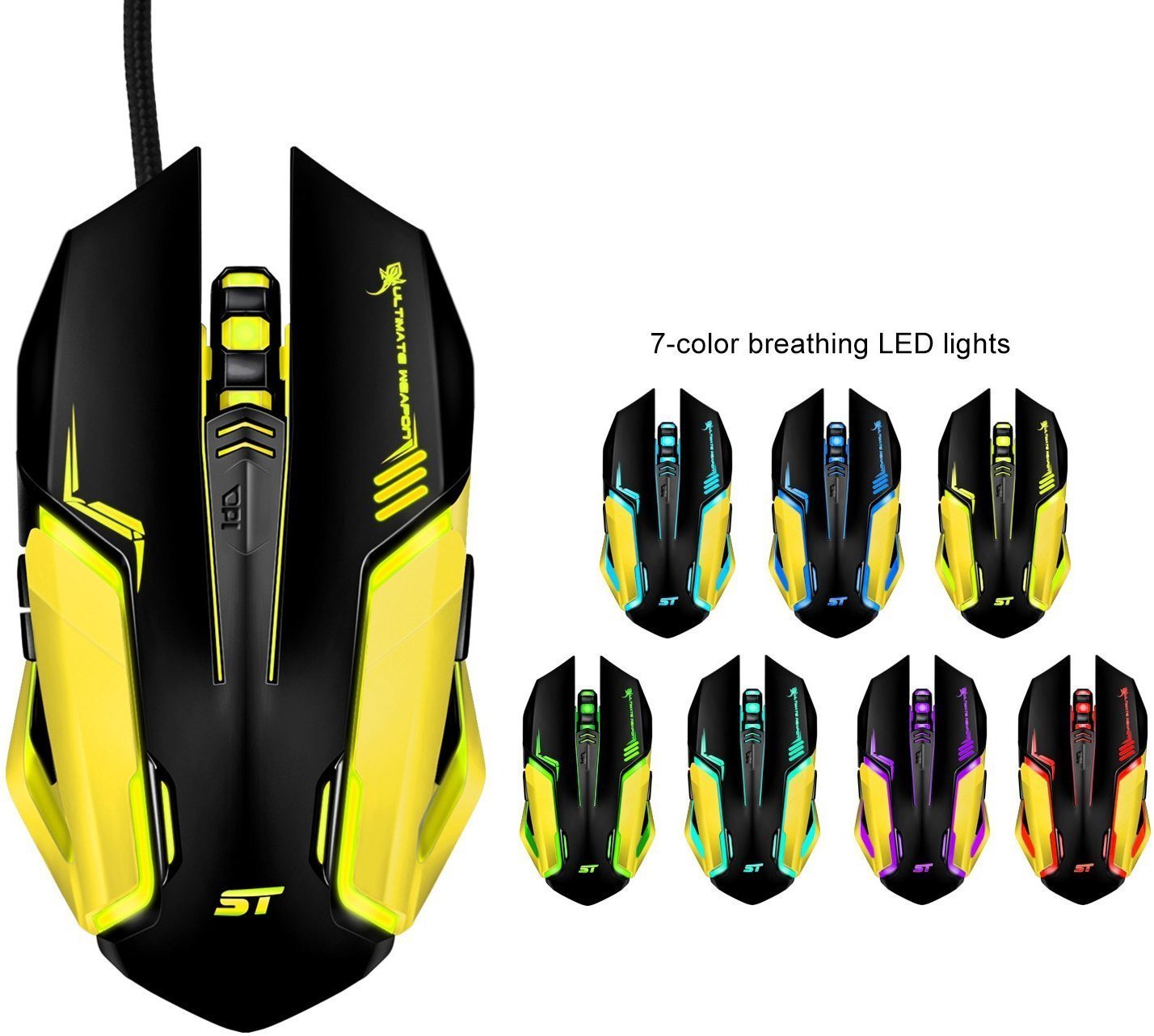 Gaming Mouse SOWTECH USB Wired Gaming Mice 4 Adjustable DPI Levels 7 Circular LED Light with Ergonomic 6 Buttons PC Gaming Mouse Brand New Color: Black/Yellow About the Product ADJUSTABLE 1000/1600/2400/3200 DPI levels, 2 customized polling rate and 6 buttons perfectly meet your gaming needs 7 LED COLORS BACKLIT changes its colors while in use, offering excited and unique ambient lighting USER FRIENDLY ERGONOMICAL DESIGN to fit different hand sizes and reduce hand fatigue, durable and sensitive for long time use STRONG COMPATIBLE with most system including Windows XP, Windows 7, Windows 8, Windows 10, Mac and Linux. Fit for PC, Laptop, Desktop and Macbook YOU WILL GET 1 SOWTECH Gaming Mouse Product Description Supreme Comfort and Ergonomic Design With a lightweight (102g) and ergonomically designed body, the SOWTECH gaming mouse is made to fit your hand for long-lasting comfort during game play. Easy To Use Just Plug and Play. NO additional software or firmware is required. Strong Compatibility: Compatible with most system including Windows XP, Windows 7, Windows 8, Windows 8, Windows 10, Mac and Linux. Fit for PC, Laptop, Desktop and Mac 7 LED Light Modes: 7 different cycle breathing LED light colors change while in use, offering smoothing ambient lighting. 4 DPI Adjustable Settings: 4 DPI settings: 1000/1600/2400/3200DPI. Easily adjust the DPI via DPI button to get accurate tracking for ultimate gaming experience. Note: I am not the manufacture. Item is brand new.