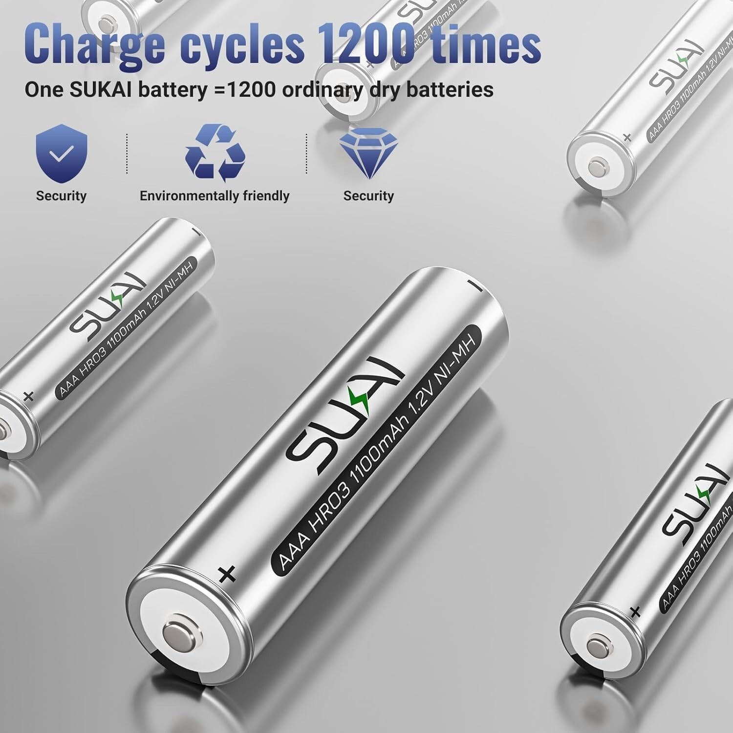 SUKAI Rechargeable AAA Batteries (8 Pack), 1100mAh High Capacity Performance Long-Lasting 1.2V, Per Charged Ni-MH AAA Batteries Low Self Discharge AAA Rechargeable Battery Product Details Size: 8 Pack Brand: SUKAI MPN: AAA1100 UPC: Does not apply EAN: Does not apply Number of Batteries: 8 AAA batteries required. (included) Brand: SUKAI Battery Cell Composition: NiMH Recommended Uses For Product: Power Tool, TV Remote, Camera Unit Count: 8.0 Count Package Dimensions: 3.43 x 1.93 x 0.55 inches Item Weight: 3.52 ounces Item model number: AAA1100 Batteries: 8 AAA batteries required. (included) Date First Available: May 13, 2021 Manufacturer: SUKAI Country of Origin: China High Performance AAA Rechargeable BatteriesWith large capacity, the 1.2V 1100mAh AAA rechargeable batteries have up to 1200 charging cycles. SUKAI AAA rechargeable batteries Ni-MH still have a high capacity that can hold 80% if not used for 3 years. Environmental ProtectionSUKAI Ni-MH AAA rechargeable batteries are durable, rechargeable and they do not contain Hg/Cd/Pb, which is no pollution to the environment. Love the environment starts from choosing SUKAI rechargeable AAA batteries! Multi-ApplicationSUKAI NiMH AAA rechargeable batteries are compatible for a variety of household equipments such as toothbrushes, alarm clocks, wireless mice, remote controls, children's toys, flashlights, garden lights, solar lights etc. Safe to UseSUKAI triple A rechargeable batteries are leak-proof and can be used in severe cold and heat, and can supply power at -20-60C. SUKAI AAA NiMH rechargeable batteriesprovide long-term stable voltage output which can performs well in extreme environments, it's reliable and safe. Use TipsIn order to ensure the safety during transportation, we usually pre-charge 20%-30%, but it is best to fully charge the rechargeable battery before the first use to extend the service life. When the AAA battery is not used for a long time, please charge it at least once within three months to avoid damage to the battery due to over-discharge.