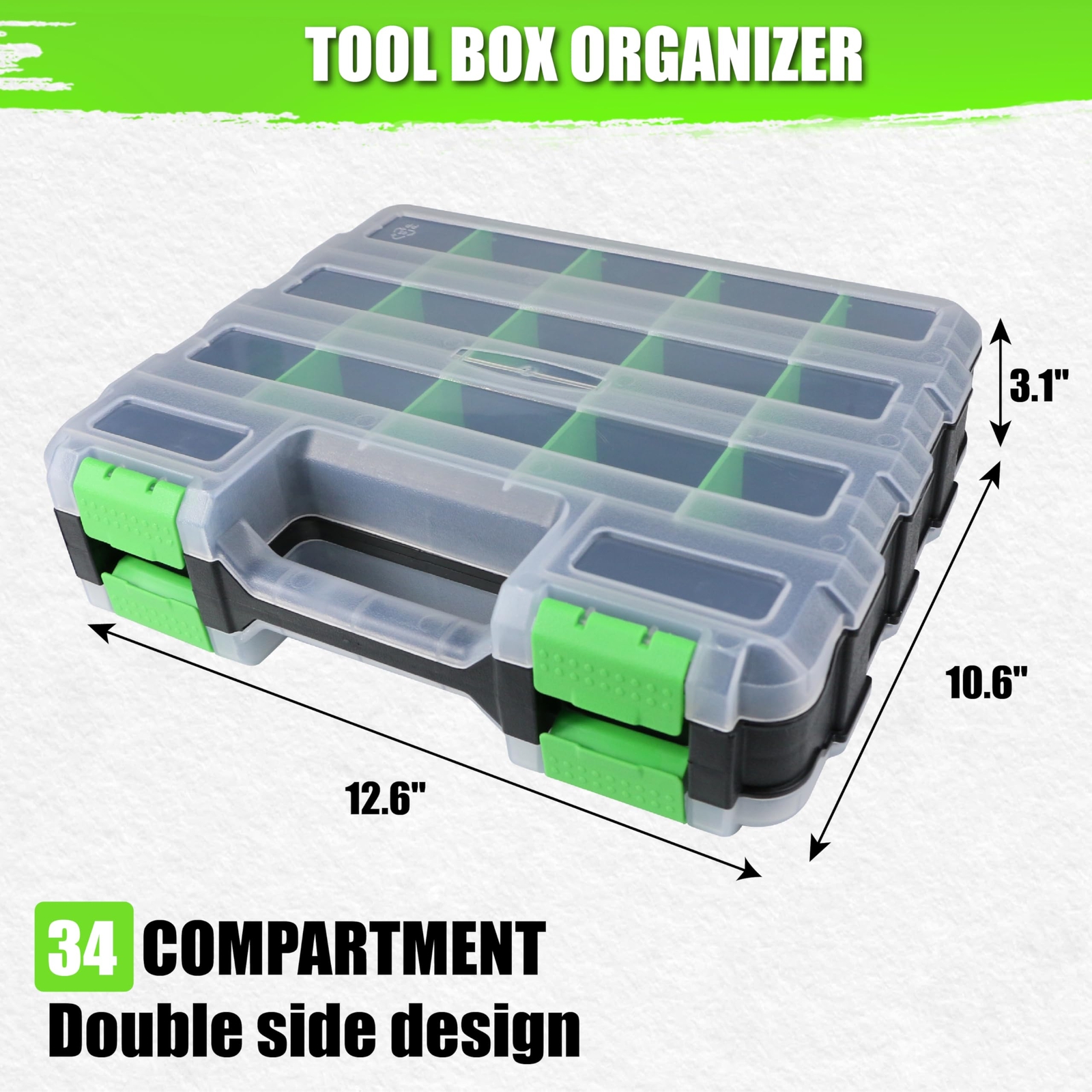 SUNHZ MCKP Small Parts Organizer, Double Side 34-Compartments Tool Box Organizer with Removable Plastic Dividers, Hardware Storage Organizer for Screws Nuts Nails Bolts Small Hardware 34 COMPARTMENT TOOL ORGANIZER: Double side design including 30 removable compartments and 4 fixed compartments prevent mixing of items. Removable dividers are easily slide on and off to customize the storage space. HEAVY DUTY MATERIAL: Screw organizer box made of durable and heavy duty plastic material, sturdy and well built. An attractive color combination in black body and transparent lids easier to identify the tools or screws inside. PORTABLE & WITH SECURE LATCHES: Secure latches can open and close smoothly to prevent the inner items fall off while carrying. The top handle can easy to carry the storage organizer, easily store it in your garage, closet, shed, or vehicle. HIGH CAPACITY STORAGE: The tool organizer box is suitable for storing various small parts, Includes fasteners, nail, screws, nuts, bolts, electrical connectors, hair accessories, beads, fishing tackles and various other smaller construction items. RISK-FREE PURCHASE: SUNHZMCKP provides all-day customer service, if you have any questions, please find us through Amazon, we will be happy to solve your problem. Thank you for your attention and support to SUNHZMCKP brand. 34 COMPARTMENT TOOL ORGANIZER: Double side design including 30 removable compartments and 4 fixed compartments prevent mixing of items. Removable dividers are easily slide on and off to customize the storage space. HEAVY DUTY MATERIAL: Screw organizer box made of durable and heavy duty plastic material, sturdy and well built. An attractive color combination in black body and transparent lids easier to identify the tools or screws inside. PORTABLE & WITH SECURE LATCHES: Secure latches can open and close smoothly to prevent the inner items fall off while carrying. The top handle can easy to carry the storage organizer, easily store it in your garage, closet, shed, or vehicle. HIGH CAPACITY STORAGE: The tool organizer box is suitable for storing various small parts, Includes fasteners, nail, screws, nuts, bolts, electrical connectors, hair accessories, beads, fishing tackles and various other smaller construction items. RISK-FREE PURCHASE: SUNHZMCKP provides all-day customer service, if you have any questions, please find us through Amazon, we will be happy to solve your problem. Thank you for your attention and support to SUNHZMCKP brand. Shipping from the USA All of our products are shipped from the USA, ensuring quick delivery to your destination. Payment We offer the following payment methods: PayPal, credit card, bank transfer, and eBay's secure payment system. Free Shipping & Free Returns Shipping within the USA is FREE. Additionally, any return is absolutely free for you. Risk-Free Purchase You have the option to return an item within 30 days without any justification. We cover the return shipping costs! Fast Shipping We ship immediately upon receipt of payment. Generally, the package is delivered within 2-3 days in the USA. If it takes longer, we will contact you. Quality and Costs Made in Europe, USA, China No customs fees or additional charges Total satisfaction guarantee Invoice with declared VAT available upon request in .pdf format Feedback Your feedback is very important to us. After you pay for your purchase, you will automatically receive positive feedback from us.