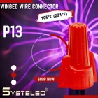 SYSTELED Red Winged Electrical Wire Bulk 500 Pack Large Twist-on P13. Details: UL/CSA Certified, plastic material for safety and electrical insulation, flame-resistant, temperature rating of 105 degrees C (221 degrees F), for use with copper to copper; in electrical appliances, lighting and building wiring. Package: 18-8 AWG Double wings wire twist connectors red, Bag of 500 Wire Connectors. Features: Hold wires firmly and durable, reusable, color-coded simply separate hundreds of wire combination, no need pre-twisting wire, soldering or electrical tape, no tools necessary. Purpose: Anyone who does any type of electric work or project for home theater, buildings or used for electrical wires in hvac, lamps and any other household wiring.