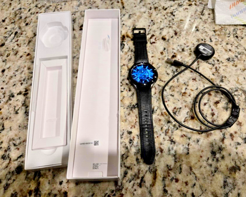 Barely used. Mint condition, screen protector attached. Comes with black leather band and if I can find it, a black rubber one as well. Has all original packaging. 100% Positive Feedback for 20 years ! Buy with confidence. Details from original order below : Galaxy Watch4 Classic, 46mm, Black, LTE SM-R895UZKDXAA QTY: 1 PRICE: $339.99 $429.99 Galaxy Watch4, Galaxy Watch4 Classic Hybrid Leather Band, S/M, Black ET-SHR88SBEGUJ QTY: 1 PRICE: $0.00