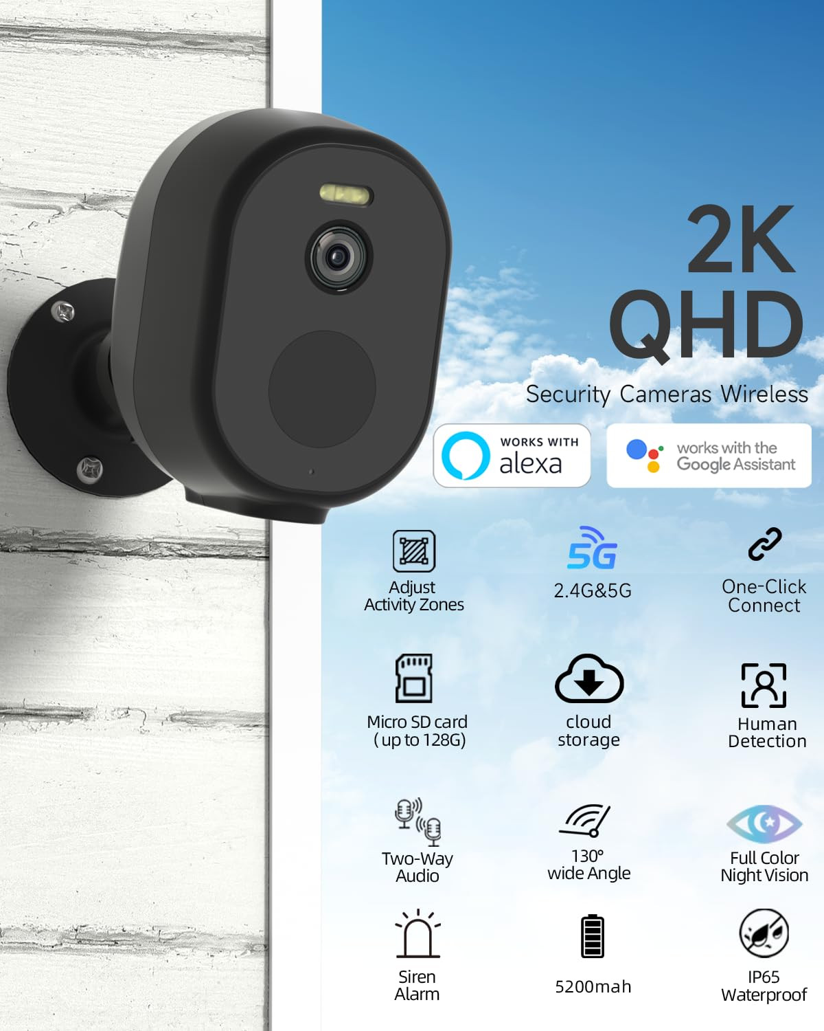 5G/2.4G WiFi Security Cameras Wireless Outdoor for Ultra – Fast Connectivity – Enjoy seamless, high-speed streaming with dual-band 5G and 2.4G WiFi, ensuring a stable, lag-free connection for real-time monitoring. Perfect for both indoor outdoor camera wireless setups. 2K Home Security Camera with Color Night Vision & Starlight Sensor – Capture every detail in stunning 2K resolution with a 130° wide-angle view. This WiFi Surveillance Indoor Home Camera features advanced night vision technology for full-color clarity, even in complete darkness. Battery Operated Outdoor Security Camera with 5200mAh Battery & Type-C Charging – Equipped with a high-capacity rechargeable battery, this wireless security camera outdoor lasts 1–3 months on a single charge. Type-C charging ensures quick and easy power-ups. AI Motion Detection for Smart Alerts – This Security Cameras Wireless Outdoor system provides instant notifications with built-in human detection. Vehicle, animal, package, and flame detection features are available with an optional subscription. Two-Way Audio & Built-In Siren for Added Protection – This outdoor wireless cameras for home security system lets you communicate via the app with crystal-clear two-way audio. Activate the siren and strobe light remotely to deter intruders. IP66 Waterproof Wireless Security Camera Outdoor for All-Weather Use – Built to withstand rain, snow, and extreme temperatures, this durable outdoor security camera is designed for long-term performance. Flexible Storage: Local & Cloud Recording for Maximum Security – Store footage with a TF card (up to 128GB, card not included) or secure cloud event recording (15s–2min clips). This wireless security camera gives you complete control over your data. Works with Alexa & Google Assistant for Hands-Free Control – This WiFi Surveillance Indoor Home Camera seamlessly integrates with your smart home, allowing you to check live feeds with simple voice commands. Quick Bluetooth Pairing & Easy Setup – This indoor outdoor camera wireless model features hassle-free installation with Bluetooth pairing, so you can start monitoring in just minutes.