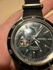 *Disclaimer: Watch is sold USED and AS IS* -Comes with one strap, a black NATO. -Watch is in beautiful shape except two light scrapes on the glass at the 11 o’clock position (Shown) -Guaranteed running and working. -Comes with original box and paperwork The Seiko Presage “Ginza” Limited Edition Watch (SSA445) is a stylish and sophisticated timepiece designed for men. Featuring a sleek silver case with a black bezel and a blue dial with sector pattern and baton indexes, this watch exudes a casual yet elegant style. The watch has a 41mm case size with a 12.8mm case thickness, made of stainless steel with a water resistance of 50m (5 ATM). It also boasts a self-winding mechanical movement and comes with a stainless steel bracelet with a push-button deployant closure, making it both practical and reliable for everyday wear.