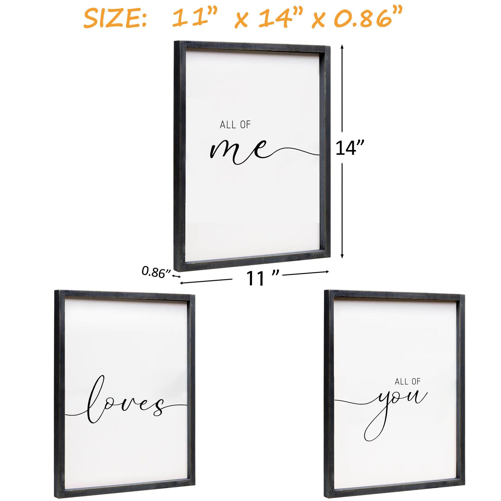 Set of 3 Framed Farmhouse All of Me Loves All of You Sign 11x14” Above Bed Wall Decor for Bedroom Decor Wall Art Wood Signs EASY TO INSTALL: The All of Me Loves All of You sign over bed wall decor for bedroom over bed wall decor is a lightweight piece making it easy as pie to hang! You will love the simplicity of how easy it was to go from taking out the box and hanging it on the wall. Screws are included in the package too. Or just simply sit it on your nightstand. GREAT NEUTRAL ADDITION TO BEDROOM DECOR: “All of Me Loves All of You” each part of the phrase is separated, as it gives a unique look. Modern farmhouse style combines rustic decor with modern elements. The bedroom sign fits right in with any farmhouse and early Americana style for any master bedroom or guest bedroom decor. INSPIRATIONAL PLAQUE: The framed religious wall decor is such a quality piece and wonderful reminder to you. It's great for anyone to look at before they go to bed. As you know, life is full of bittersweet, and we just need some positive thoughts sometimes. GOOD IN CRAFTSMANSHIP: The bathroom decor is made from reliable wooden construction, wear and tear resistant, lightweight but in good shape. This sign is well framed with wood and really cute. The lettering is crisp and clean. There are no smudges and the background is bright white. A PERFECT GIFT IDEA: The All of Me Loves All of You signs are perfect gift for parents, friends, lovers, teachers, Birthday, Christmas, Valentines Day, Mothers Day, Fathers Day, Thanksgiving Day, New Year etc. Better buy yourself one because you are going to want to keep it!