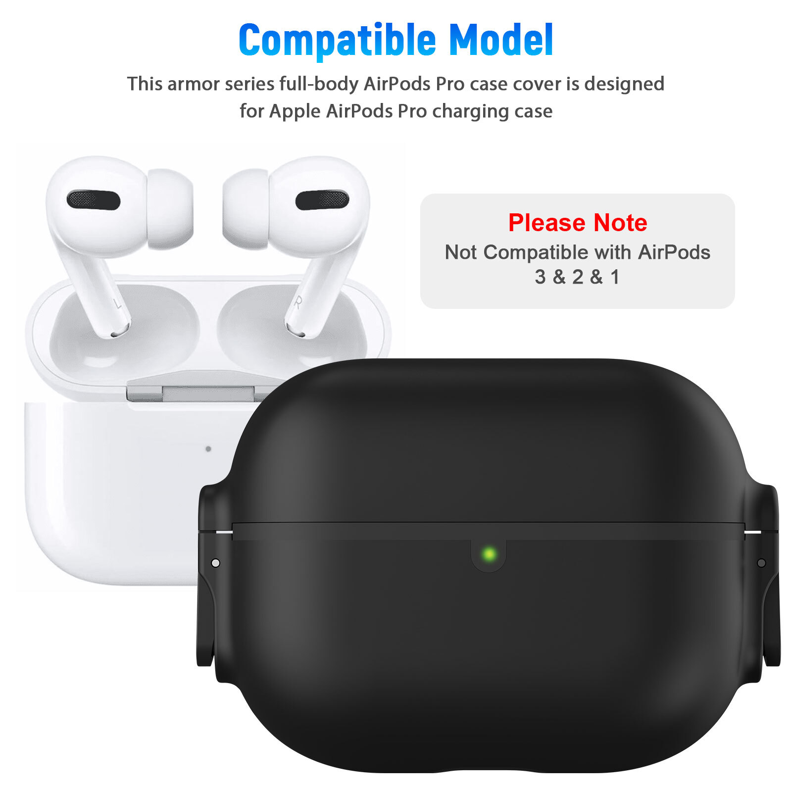 Product Features π―π Compatible Model: This Armor Series full-body AirPods Pro case cover is designed for Apple AirPods Pro 2019 charging case. Please Note: Not Compatible with AirPods1, 2 & Pro. π―π Upgraded Secure Lock: The locking function can secure the cover of the shell firmly, open the top cover with one click. The AirPods Pro case also comes with a portable carabiner clip to easily hook it on to your bag, belt loop, keys...at your convenience. π―π Full Protection: Airpods Pro case for men is made of military-grade resistant PC material and with secure lock clip design, which provides full protection for your Airpods Pro from drops, scratches and bumps. π―π Convenient Carrying: The case for Airpods Pro come with a metal solid keychain clip, easy to carry and convenient to attach to backpack and belt. No worry to lose your Airpod Pro case. π―π Easy Charging: The protective case cover supports wired and wireless charging without removing the AirPod Pro case. Front LED for the charging case is visible. Note ππ Please Note: AirPods and Charging devices are NOT included. Product Specification Type Case for AirPods Pro 2019 Material PC+Silica Gel Design/Finish Full Protection Compatibility for AirPods Pro 2019 Color Black Features 360 Protection, Dustproof, Lightweight, Shockproof, With Clip Compatibility With for Apple Airpods Pro Package Included π1 x Protective Case For AirPods Pro π1 x Carabiner Buckle Location Description To improve your buying experience and ensure fast delivery, Your order will be shipped from the warehouse located in either new jersey or california that is closest to your address. If you have any questions, Please contact us. Thank you for your support ! Support & Share