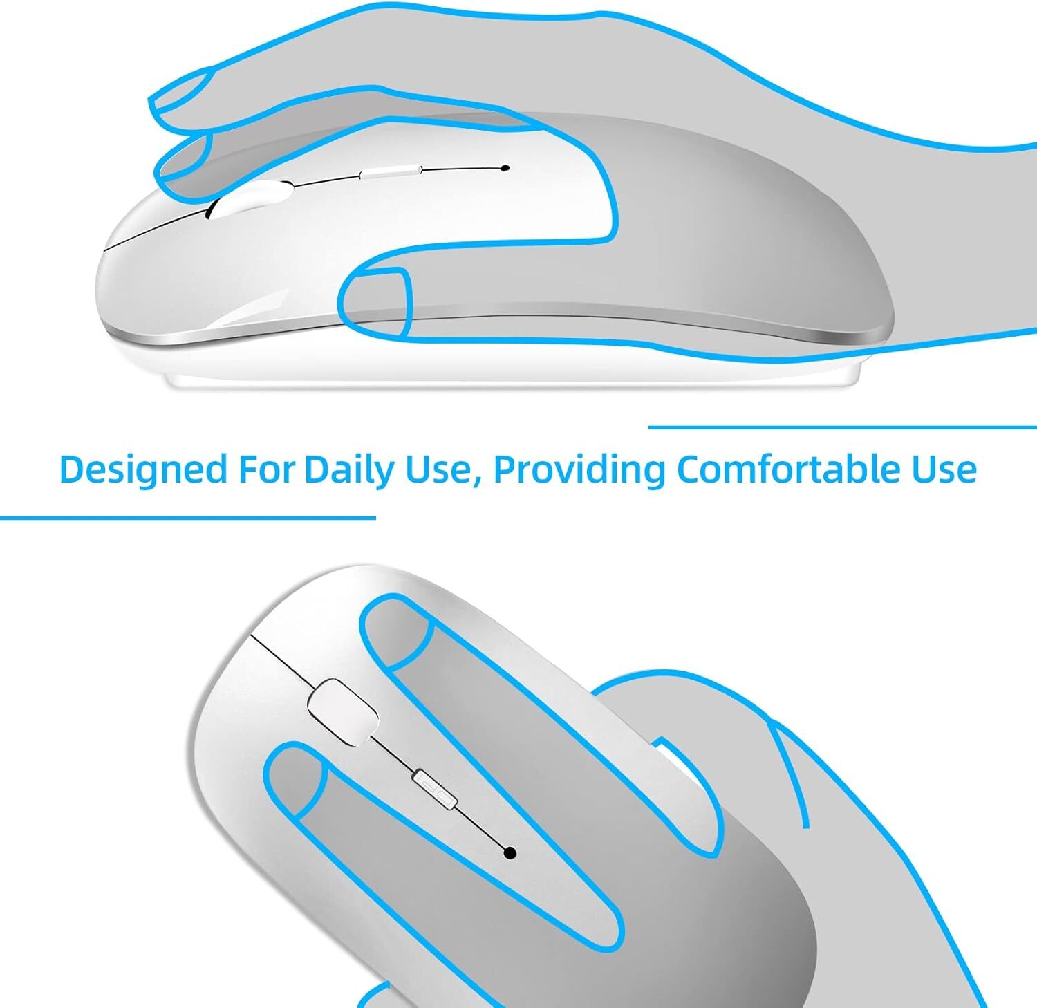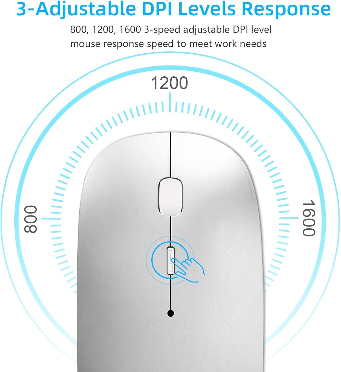 Wireless Mouse for Laptop, Bluetooth Macbook Silver Product Details Package Dimensions: 4.84 x 2.83 x 1.34 inches Item Weight: 3.48 ounces Item model number: Vxeei Batteries: 1 Lithium Ion batteries required. (included) Manufacturer: Vxeei Country of Origin: China Brand: Vxeei Color: Silver Connectivity Technology: Bluetooth, Wireless USB,USB C Special Feature: Wireless Number of Buttons: 3 ⭐【Dual Mode Wireless Mouse(Bluetooth 3.0+Bluetooth 5.2 + USB 2.4GHz)】The dual mode wireless mouse realizes switch freely between two devices with one mouse only by simply toggle switching. It can be connected to one device via Bluetooth andto another device via a 2.4GHz USB receiver. Note: Bluetooth mode and 2.4G mode cannot be used at the same time. (The default mode is BT 3.0 and for it to work in BT 5.2 there is a need also to keep pushing blue button. Then it shows as BT 5.2 mouse) ⭐【Compatibility】2.4GHz mode works with laptop, desktop or any devices with USB port or type-c port, Just plug in the USB receiver to play directly. Bluetooth mode works with Windows/ Android/ MAC OS system. Note: BT5.1system Requirement: Windows 8.0, Windows 10 or later; MacOSX 10.10 or later; iPad OS 13 or later/ Android 5.0 or later. Please check or update the operating system before use. ⭐【Rechargeable & Energy Saving Design】The mouse built-in safe and durable rechargeable battery, Attached charging cable, without the need to replace the battery. Auto energy saving technology, The mouse will go to sleep after 10 minutes of inactivity to save power and provide long-term use. Click any button to wake up. ⭐【Silent Click & Adjustable Quick Response Function】The left and right button mute processing design reduces 90% of noise. It is an ideal mouse for offices, libraries and other places where quiet is required. 3-Level adjustable DPI among 1000, 1200 and 1600 to meet different needs. ⭐【Latest Upgrade Ergonomic Design】Ergonomic Design, Slim lightweight Comfortable Cordless Mice and convenient for carrying.(Client service: Vxeei provides 24-hour online service, if you have any questions, please feel free to contact us)