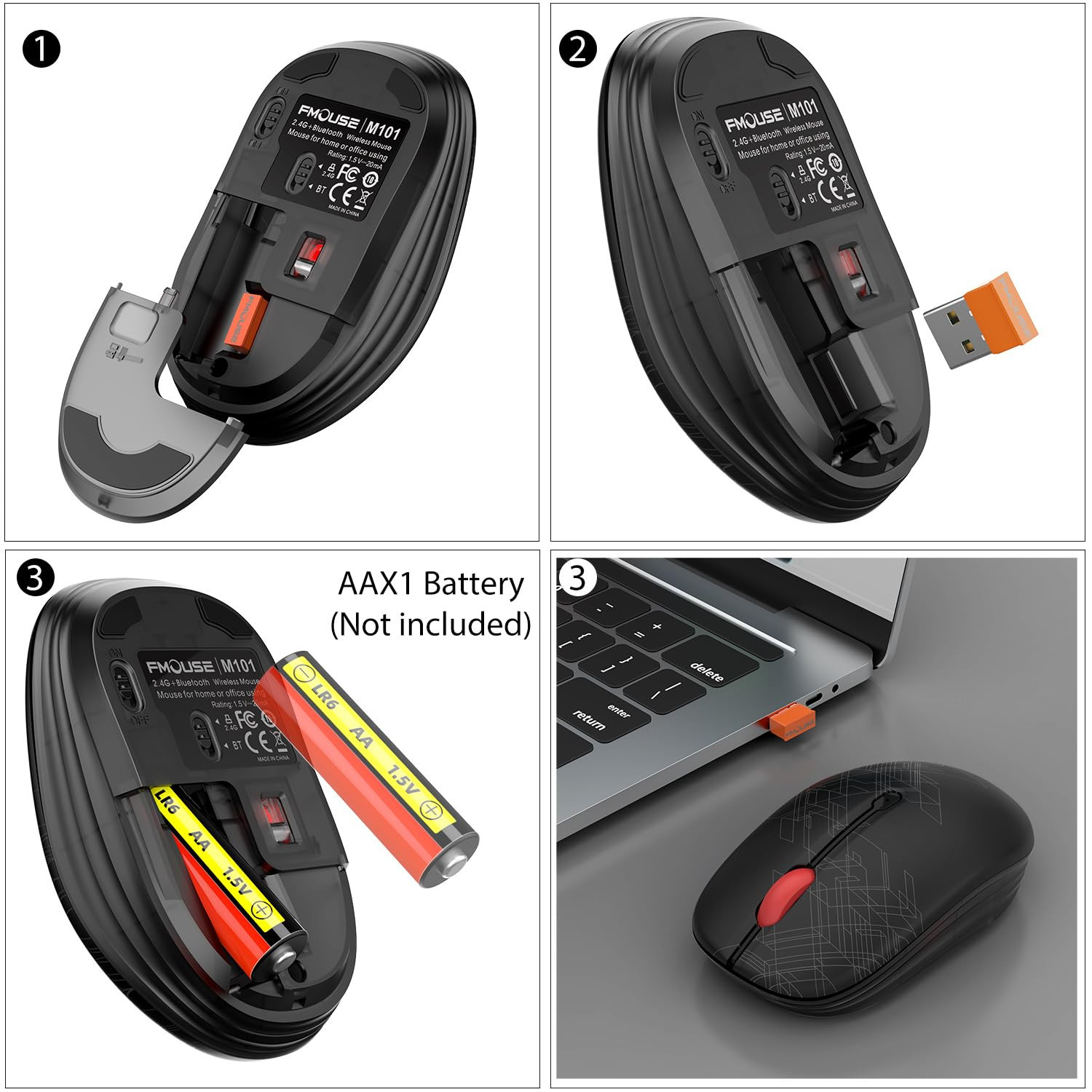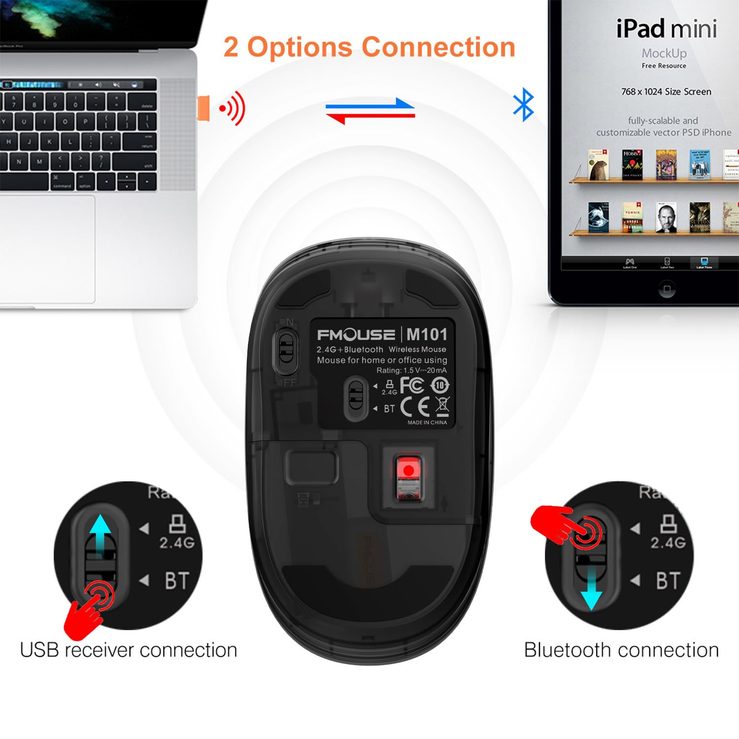 Office Wireless Mouse - Our wireless mouse sports a classic black look, with geometric lines and textures adding a touch of style. Its ergonomic design provides a comfortable grip, ideal for students and business users. Dual Mode Connectivity - One mouse for two devices. Switch between Bluetooth and 2.4G with a click. Bluetooth means quick response, precise control, stable connect, and smooth track. 2.4G secures reliable use, whether in the office or on a trip. Silent Operation - The specially engineered silent click design means no noise when you press the buttons. This allows you to work without disturbing colleagues in quiet office environments or libraries. Energy Efficient - The intelligent power-saving feature activates sleep mode after 10 minutes of inactivity. Simply click any button to wake it up. Powered by a single AA battery (not included), it offers a convenient and long-lasting power solution. Universal Compatibility - The M101 comes with built-in Bluetooth and a wireless receiver, enabling easy connection to MacBook, iPad, Laptop, or Desktop devices. It is highly compatible with Windows, MacOS, iPadOS, and Android systems.